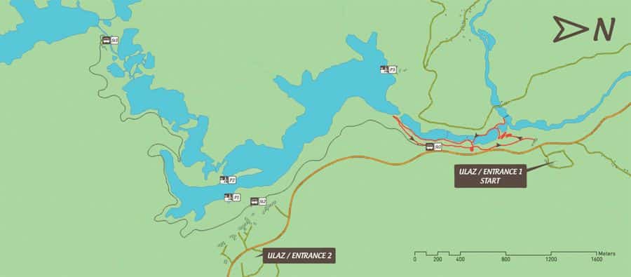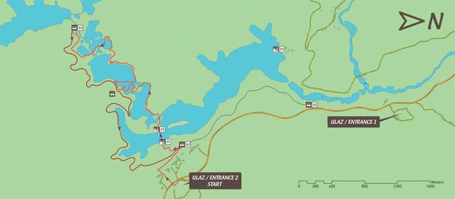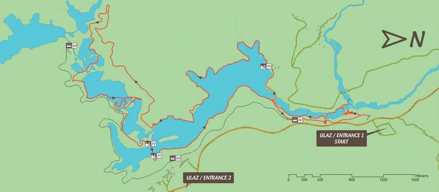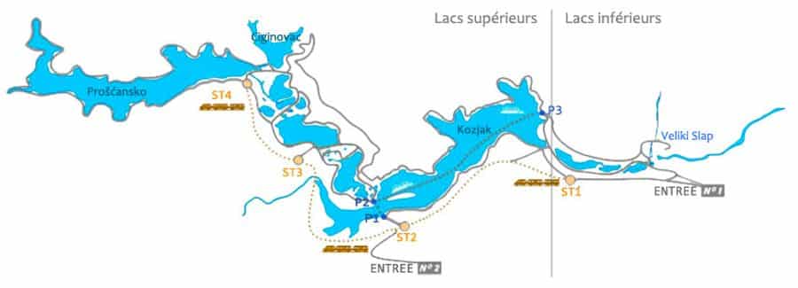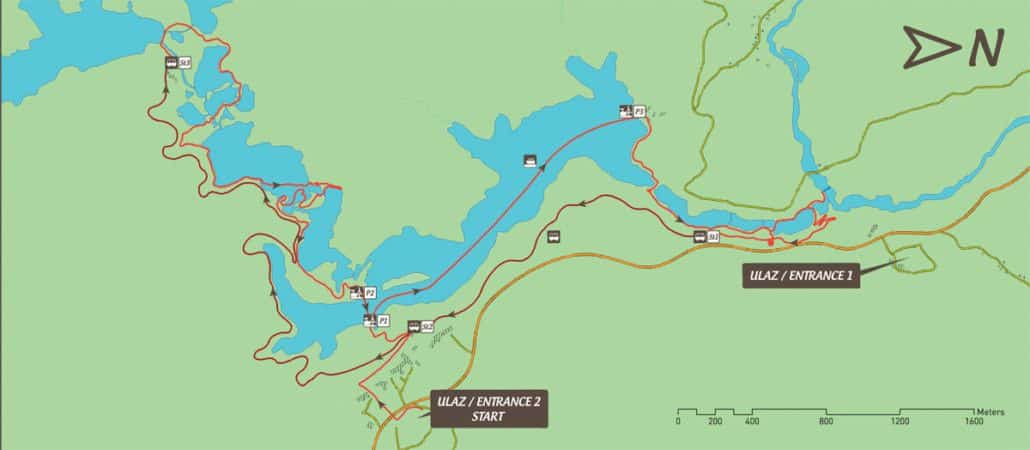 Soit vous débutez le parcours à l’entrée nord (Entrée 1) ce qui vous permet au fil d’une promenade, de découvrir l’intégralité des lacs du Parc. Le programme inclut la visite de « Veliki slap » (la Grande cascade), une promenade à travers le canyon de « Donja jezera » (les Lacs inférieurs) et le long de la rive occidentale du lac « Kozjak », puis le long d’un chemin sur les hauteurs de « Stubica », depuis lequel « Tomićeva pogledala » offre la plus belle des vues sur « Ciginovac » et l’immensité du lac de « Prošćansko jezero ». Sur le chemin du retour, vous pourrez profiter d’une promenade le long de « Gornja jezera » (les Lacs supérieurs) et de la rive orientale du lac « Kozjak », accessible par une courte traversée en bateau. Le programme se poursuit par une promenade sur la partie orientale du canyon de « Donja jezera » (les Lacs inférieurs) jusqu’au point de départ de l’Entrée 1.