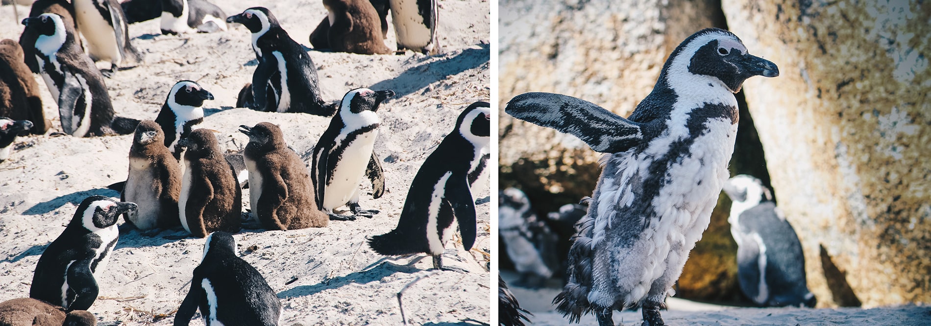 Le site de Boulders est constitué de deux parties : une plage réservée aux manchots où l’on peut les observer sans les déranger depuis les passerelles en bois leur petite tête et leur démarche rigolote pour la maudite somme de 70 ZAR/pers et une seconde plage où il est possible de poser sa serviette. Il arrive que quelques manchots viennent vous voir mais ils sont nettement moins nombreux. Cette petite réserve est agréable à faire, surtout si vous êtes en famille car la localisation des manchots est très restreinte, on en voit pas partout (peut être un peu à Robben Island).