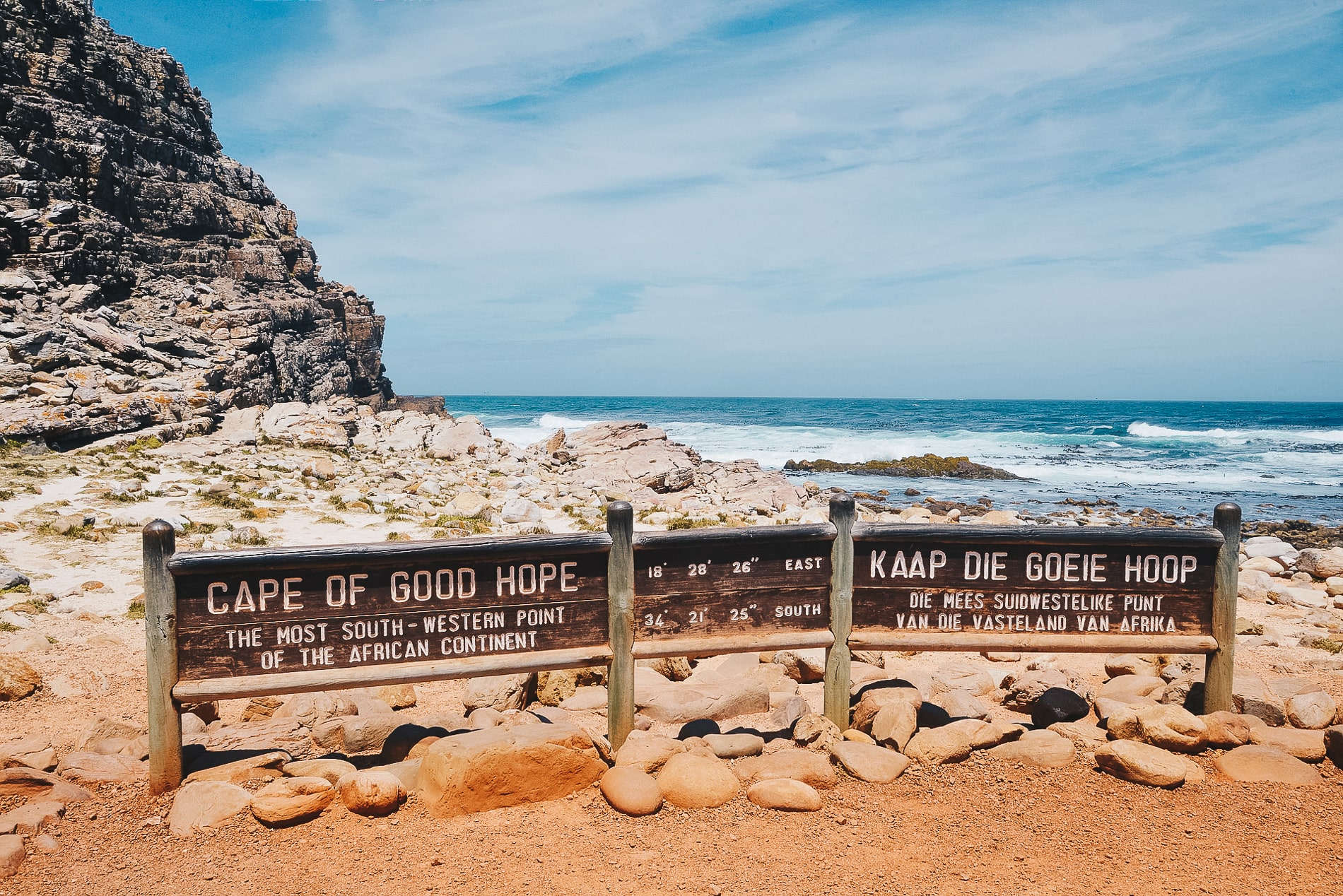 Le Cap de Bonne-Espérance ( Cape of Good Hope en anglais ) est un promontoire rocheux qui abrite une réserve naturelle parcourue de sentiers côtiers. c’est quasiment le bout du monde en Afrique du Sud mais ce n’est pas le point le plus au sud de l’Afrique. Pour cela il faut aller au Cap Aguhlas à 130 km de là. Mondialement réputée, c’était incroyable d’être à cet endroit mythique !