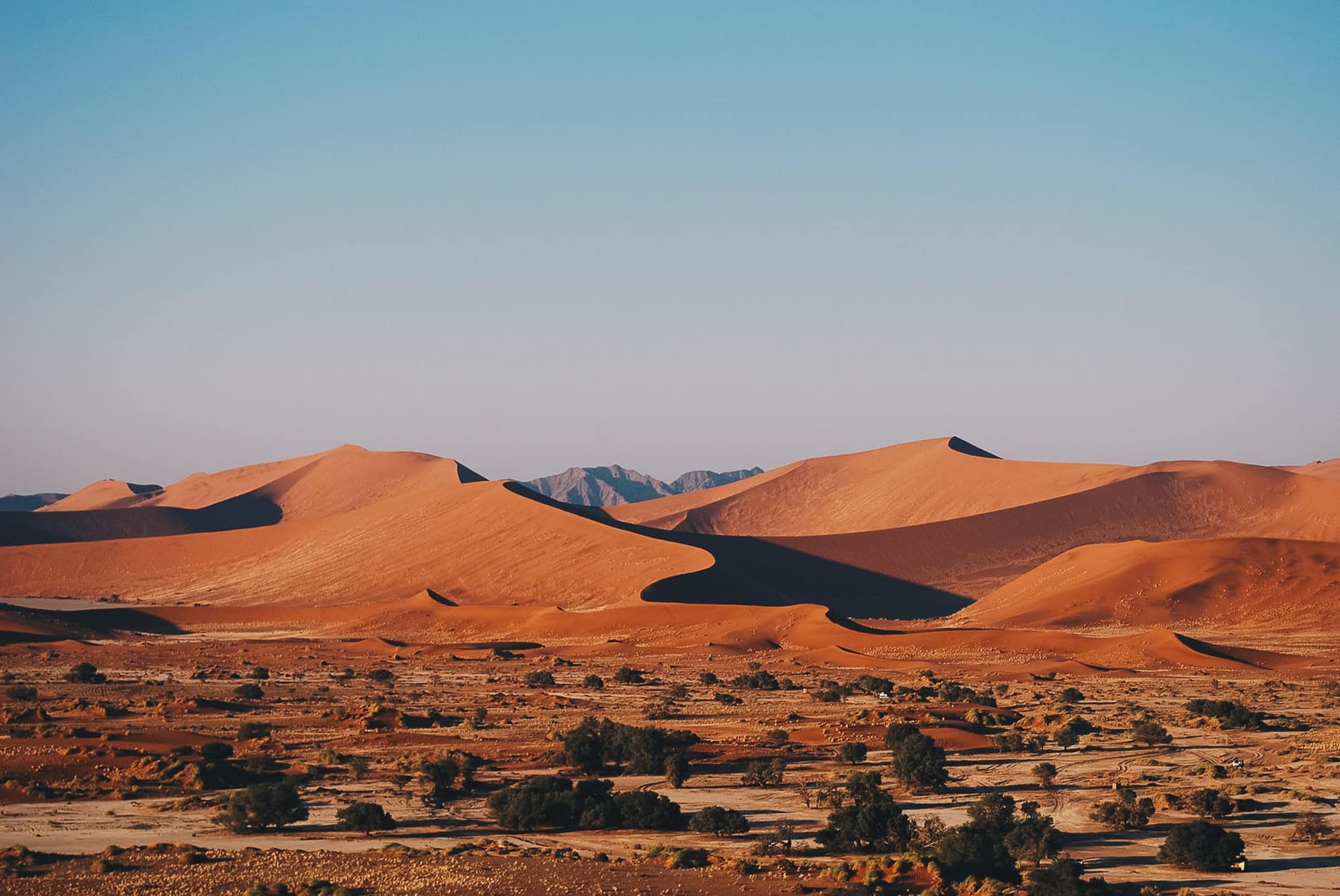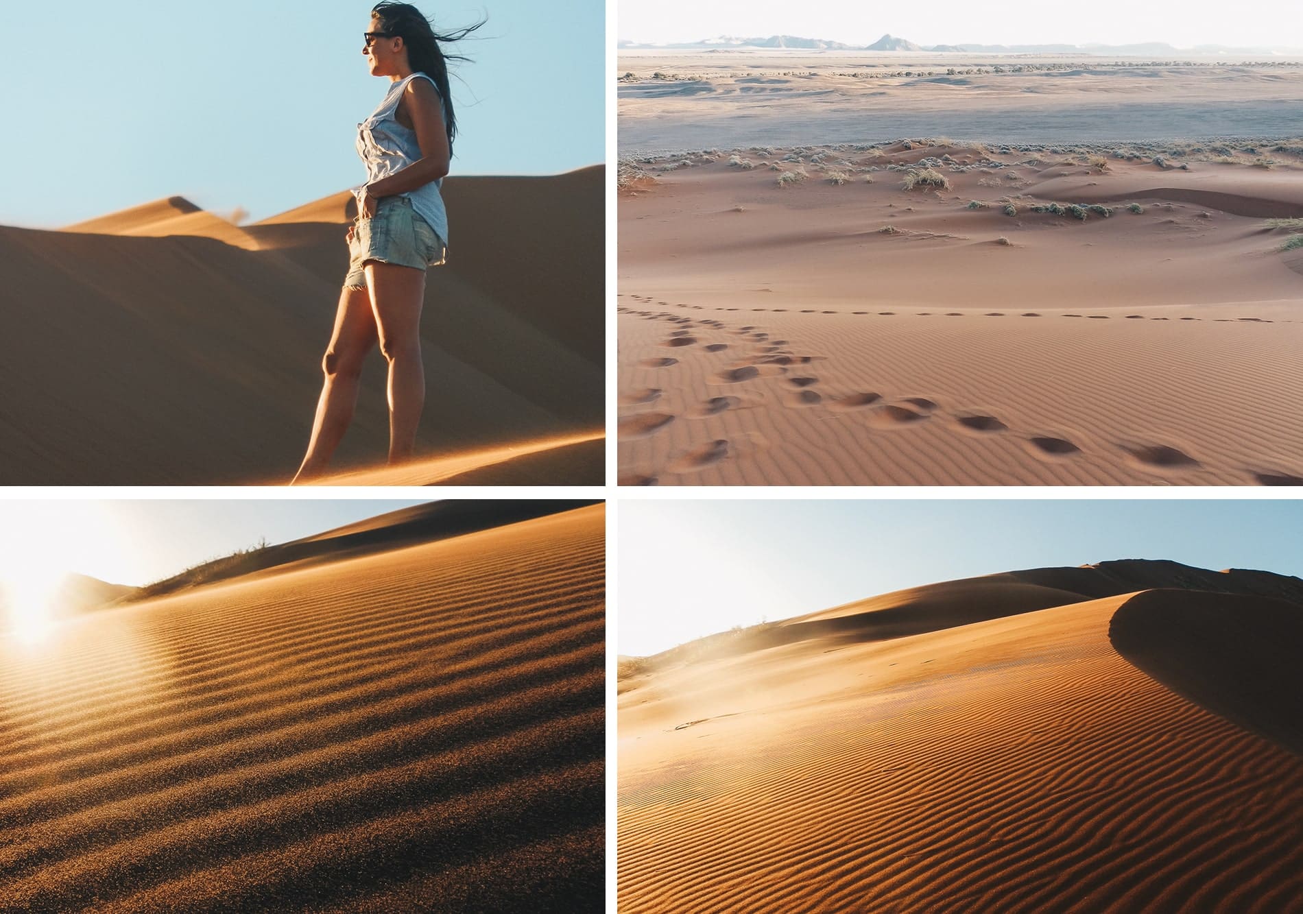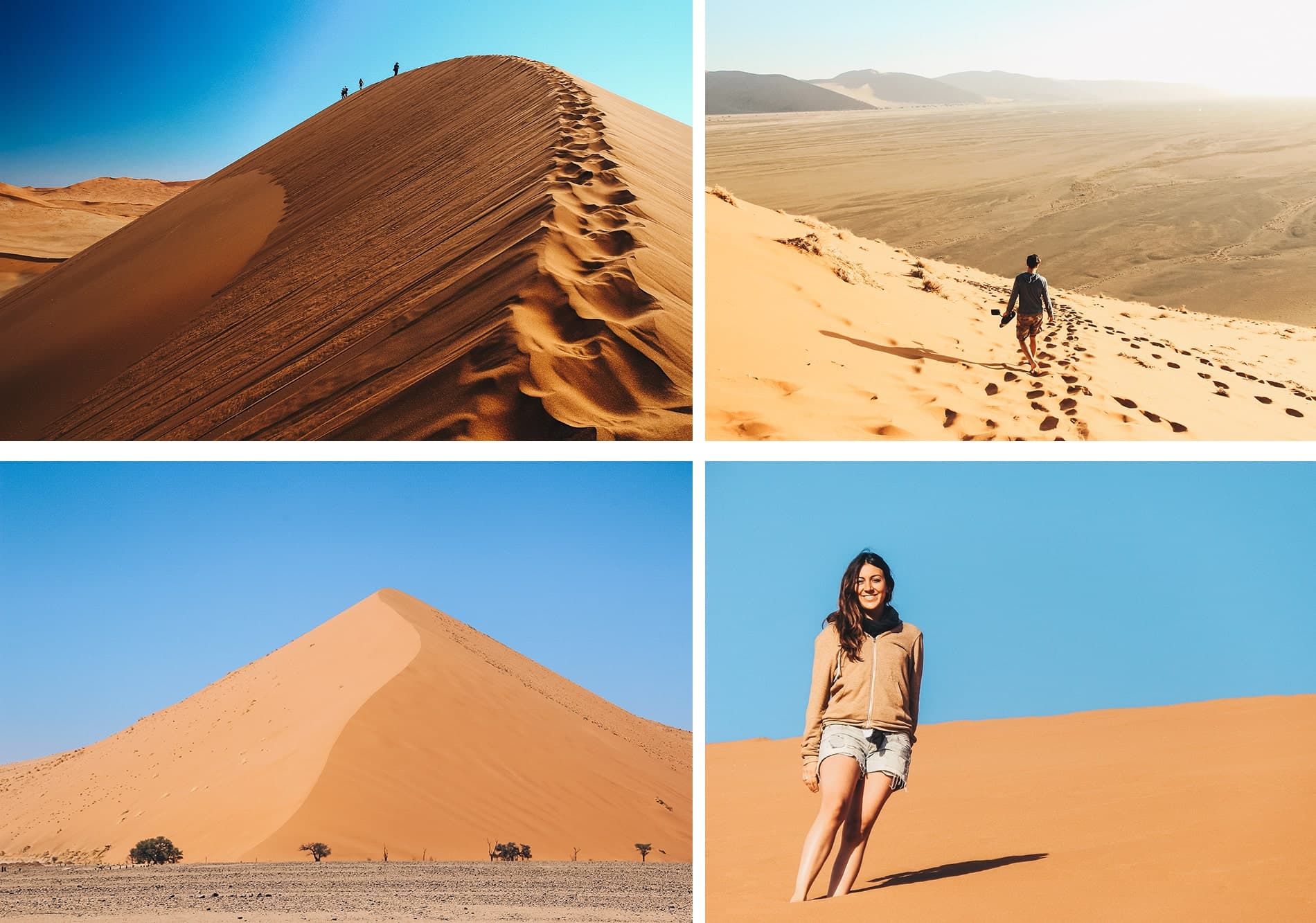 - Le désert du Namib, le plus vieux désert au monde situé dans la région de Sossusvlei au cœur du parc national du Namib-Naukluft, est un endroit unique au monde, de toute beauté, réputé pour ses immenses dunes de couleur rouge et dorée dont la dune 45 et la Big Daddy s’élevant à plus de 300 mètres d’altitude. C’est à l’aube, très tôt au crépuscule que vous visiterez ce site. Faire un lever de soleil au dessus de ces dunes a été un moment magique du voyage. Attention, en pleine journée, les températures sont extrêmement chaudes. Depuis le haut des dunes, le panorama est à couper le souffle, vous y verrez le Deadvlei, ce désert de sel blanc avec ses acacias brûlés par le soleil. La descente en courant dans les dunes est aussi un grand moment. Pour terminer le spectacle en beauté, un survol en Montgolfière au dessus de ces paysages est un immanquable de ce voyage. On vous en parle un peu plus bas.
