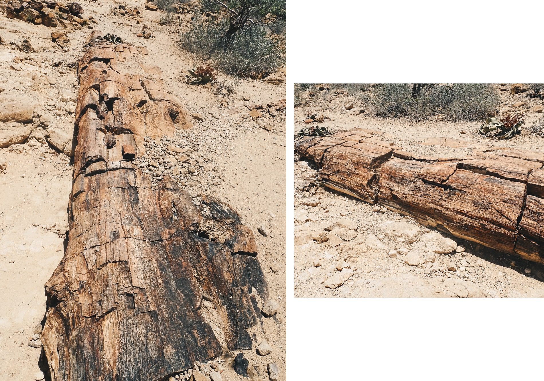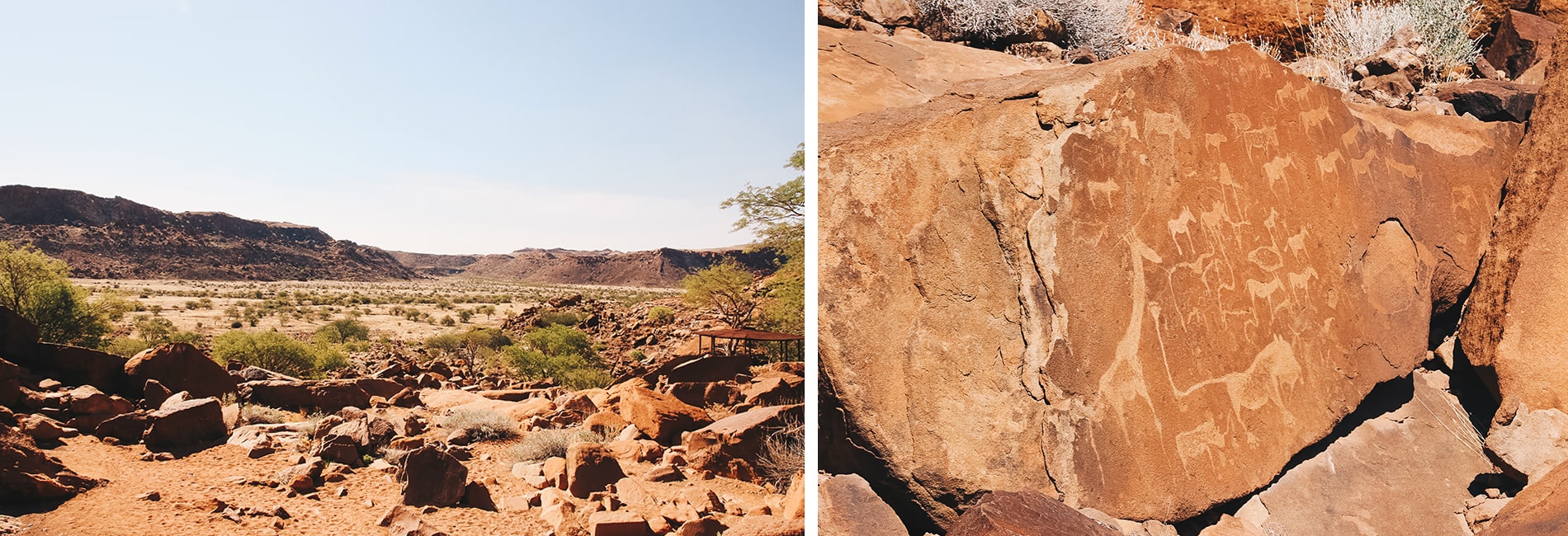 - Damaraland: Le Damaraland abrite le massif du Brandberg, une montagne de granit rose et Twyfelfontein, un des plus grands sites rupestres que j’ai pu visiter datant de plus de 6000 ans. Les gravures d’animaux ont été réalisées par des chasseurs de la Tribu San et permettent de mieux comprendre la façon dont vivaient nos ancêtres au temps et où ils se déplaçaient dans les savanes africaines. Ici c’est également de point de départ pour la « Burnt Mountain », « Organ Pipes », petite gorge qui renferme des colonnes de dolérite hautes de 4-5m et la « Petrified Forest », vaste étendue où nous avons pu voir des fossiles de conifères, plus exactement des troncs d’arbres pétrifiés dont certains atteignent plus de 30 mètres de long. Le site est classé monument national et il est formellement interdit de ramasser même le plus petit bois au sol sous peine de recevoir une belle amende. Plus de 10h de piste à sauter dans tous les sens, à s’arrêter à chaque point de vue, que de souvenirs magiques et inoubliables!