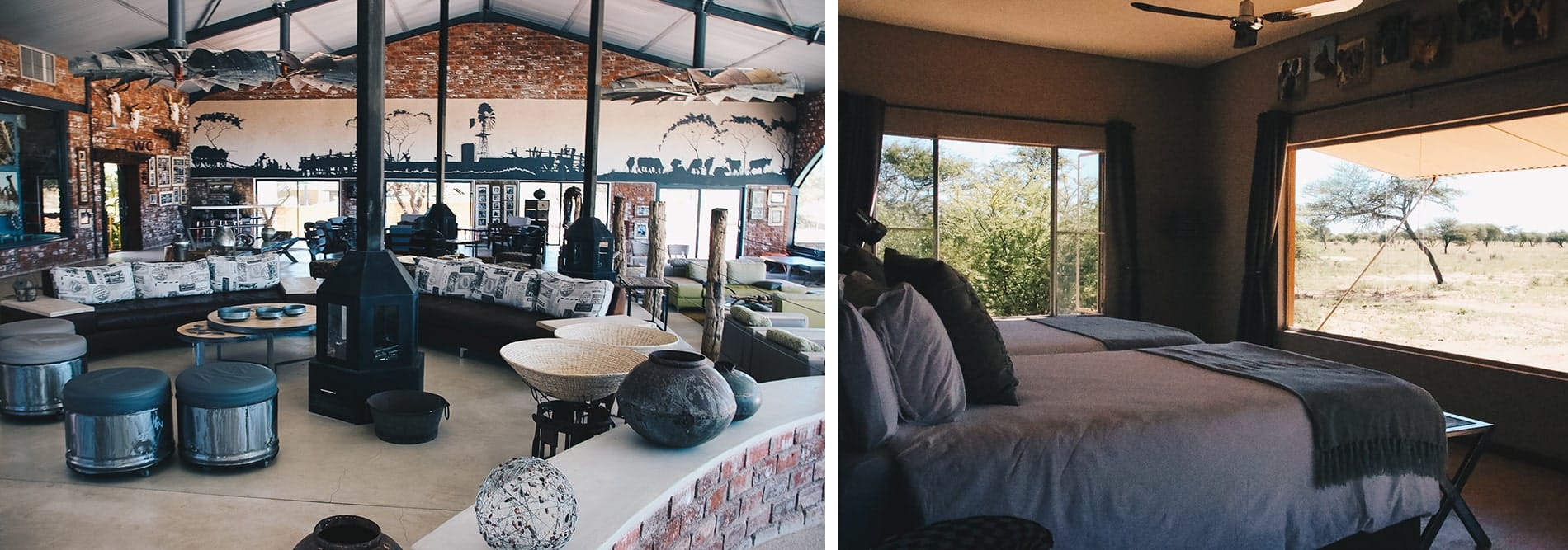 Okonjima est en droit très haut de gamme, à la décoration industrielle avec des matériaux récupérés, qui fait travailler environ 200 personnes avec des gens passionnés comme Martin notre guide. L’endroit compte 24 chambres, 8 chalets dans le bush camp et 1 suite exceptionnelle avec un guide privé et un chef. Il existe également une villa de 4 chambres dans le parc, construite à l’abri de tous les regards. Une villa qui a attiré Brad Pitt et Angelina Jolie. Ils y ont séjourné quelques jours ici avec leurs enfants.