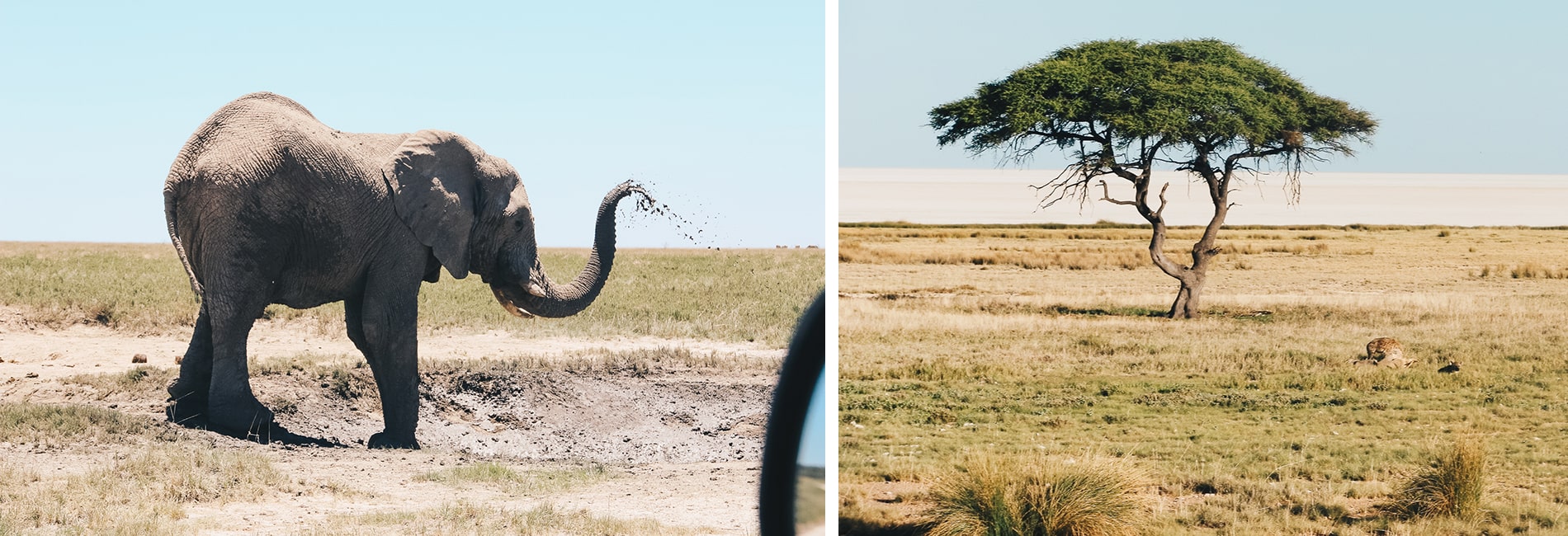 Le Pan du Parc Etosha, un immense désert salin quasiment asséché, qui ne dépasse pas les 20 cm d’eau lorsqu’il pleut, attire un nombre impressionnant d’animaux en particulier pendant la saison sèche de mai à octobre. On peut y voir les fameux Big Five (buffles, éléphants , lions, léopards et rhinocéros). L’observation y est plus facile car l’herbe est courte et le nombre de points d’eaux y est réduit, du coup la vie sauvage est très présente : félins, primates, ruminants, mammifères à sabot tels que les zèbres de montagne, éléphants d’Afrique, Hippopotame, girafes, rhinocéros mais aussi les carnivores, oiseaux de proie et oiseaux tels que pélicans et flamants nains offrent un des plus beaux spectacles du milieu naturel africain et peuplent l’espace autour de cette lagune peu profonde.