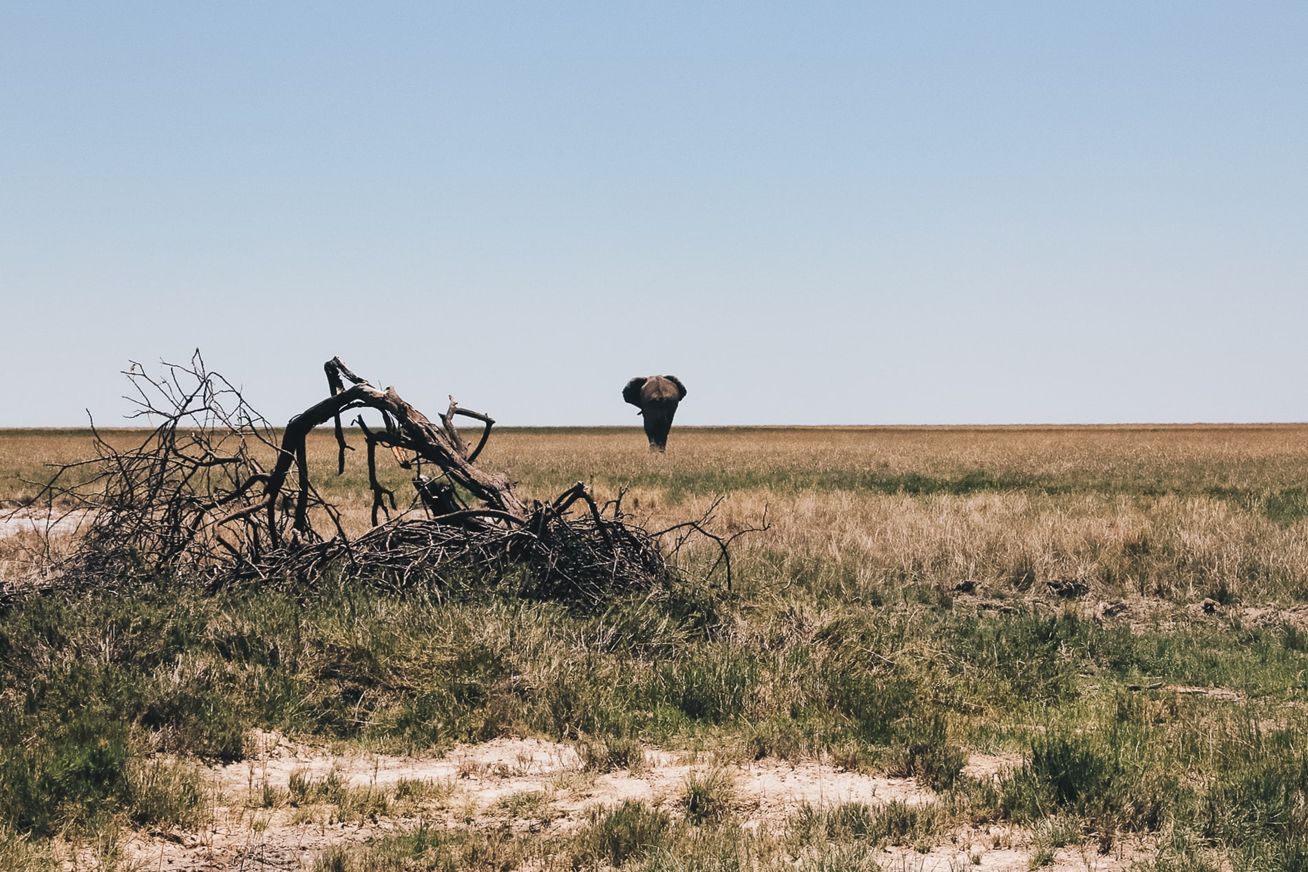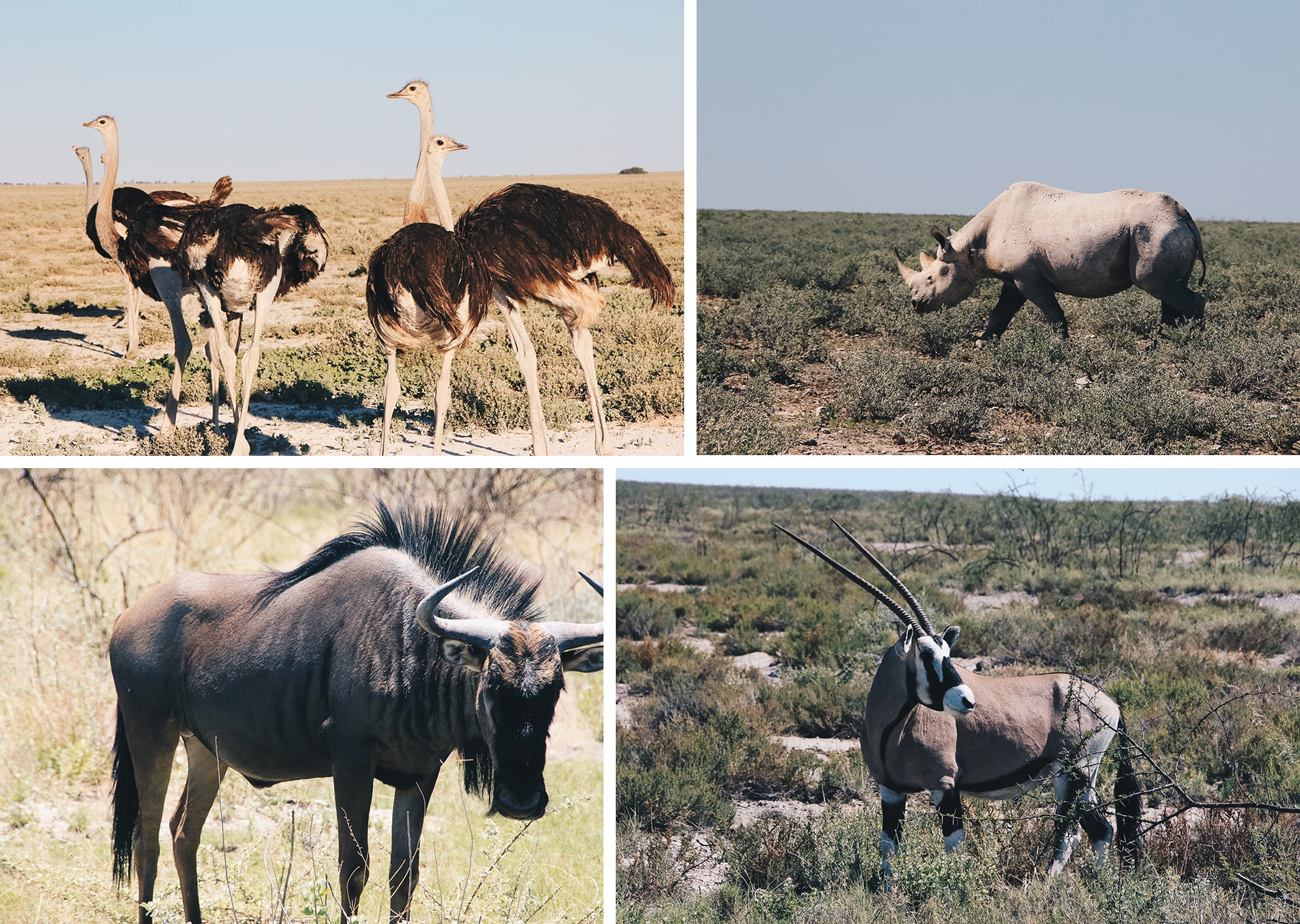 Les Water Holes (trous d’eaux), dissimulés dans le bush (traduction savane) vous permettent d’être aux aguets au lever et au coucher du soleil pour y voir lions, girafes, antilopes appelées springbok et gemsbok, léopards si vous êtes chanceux, guépards, le célèbre rhinocéros noir, vedette du parc mais aussi une espèce malheureusement menacée! Nous avons été fasciné par l’approche curieuse de celui ci, tout près je dirais à 10 mètres de nous ! Un petit conseil retenez bien votre souffle car l’attente vaut vraiment le détour !