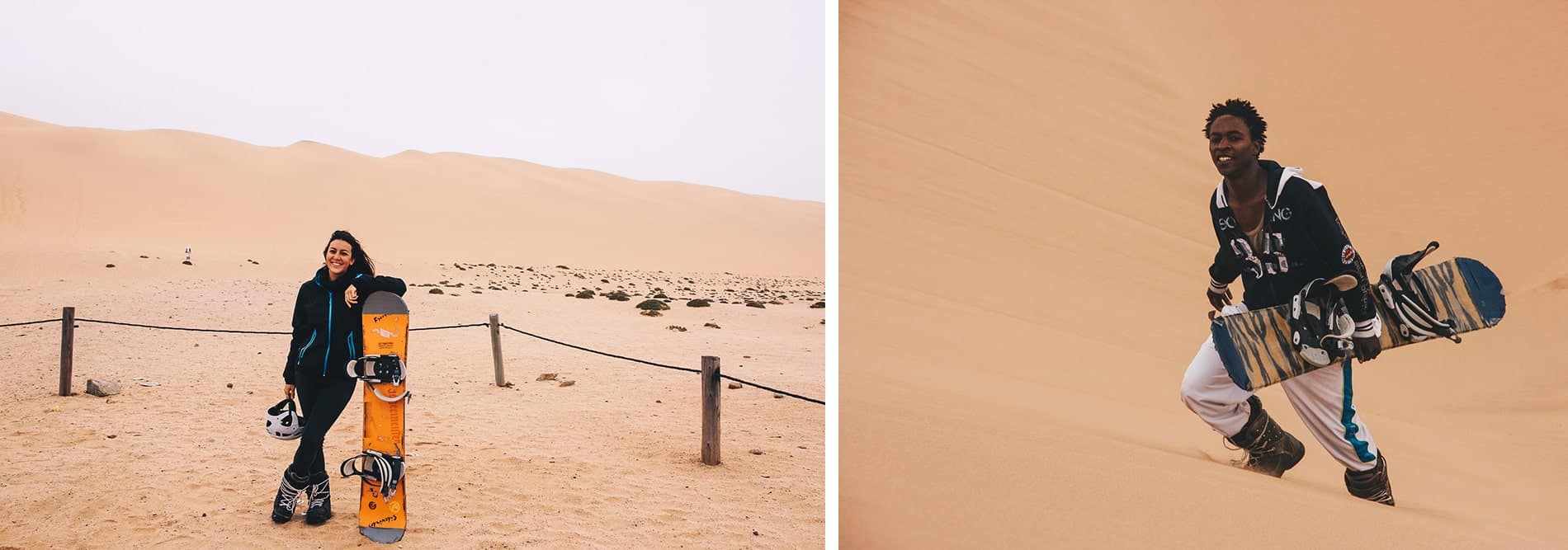 C’est à Swakopmund, à 20 minutes du centre ville que nous avons surfé dans les dunes. Swakop pour les intimes est surtout réputée pour la pratique de sports extrêmes: saut en parachute ou le sandboarding, c’est-à-dire descendre la pente d’une dune en surf ! Nous ne sommes pas venus à Swaokopmund pour nous baigner dans une eau à 14 degrés mais pour bel et bien glisser sur les dunes de sable à 120 mètres de haut, en surf et en planche. Une demi journée à dévaler les pistes de sable et sans remonte fesses.