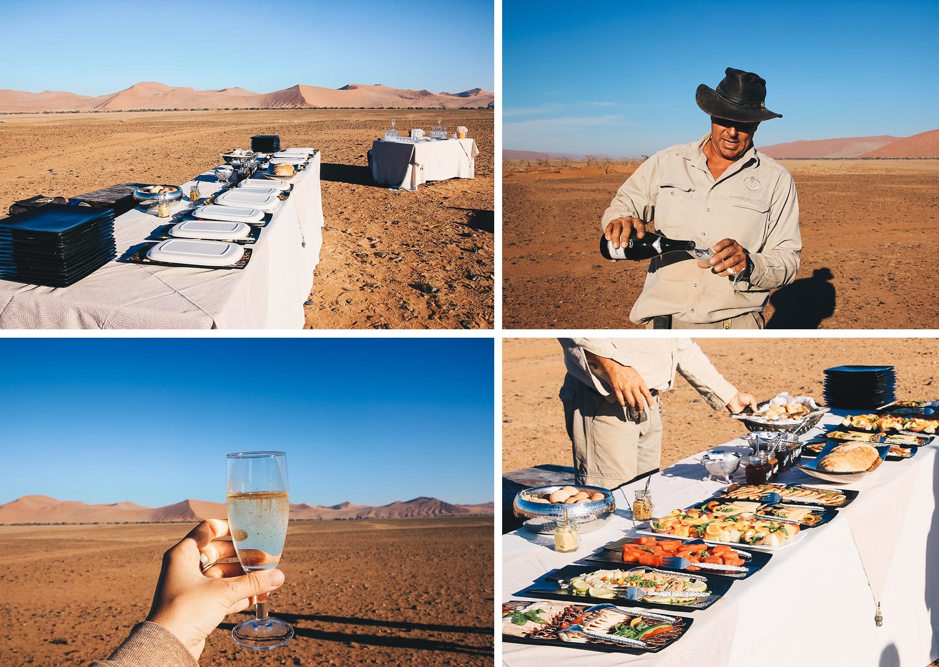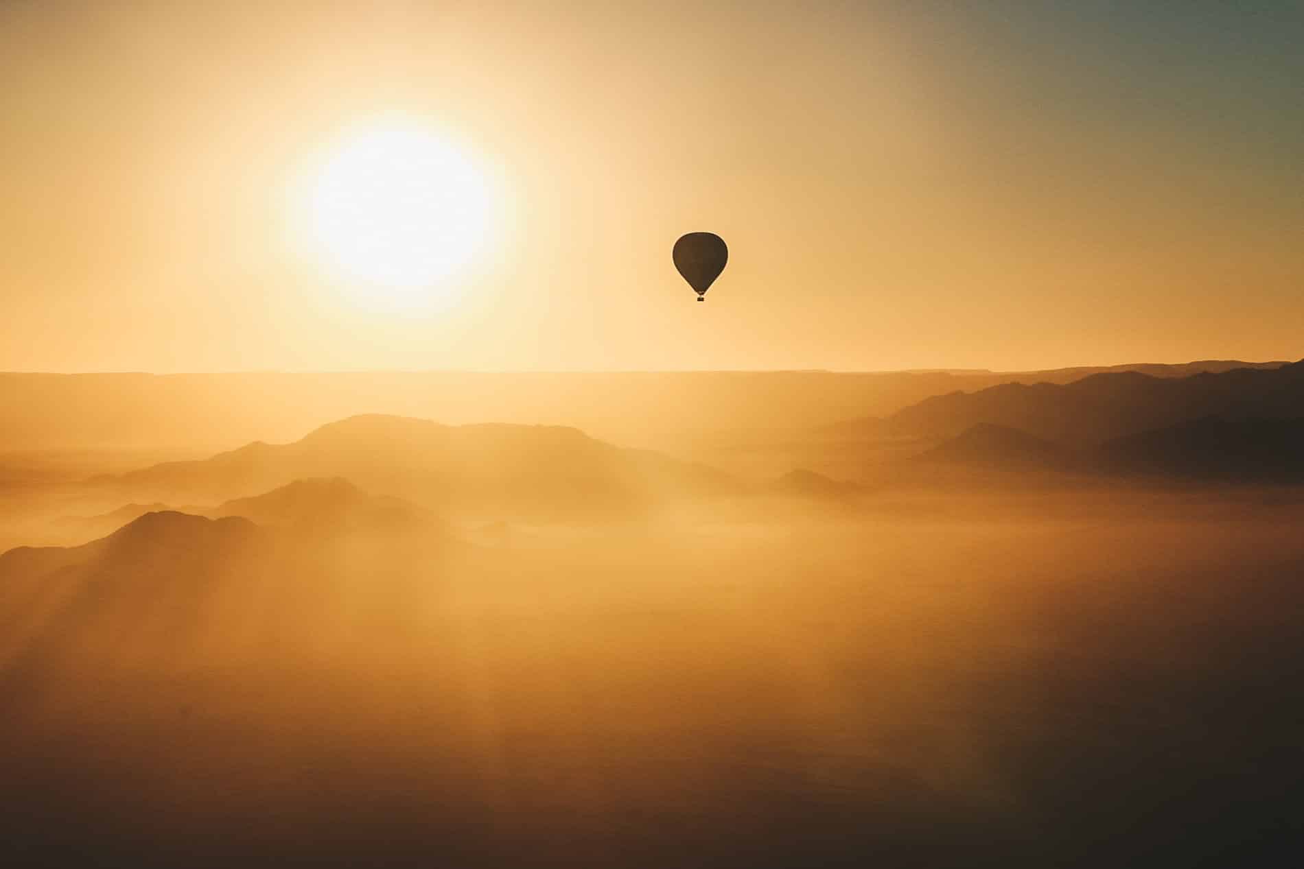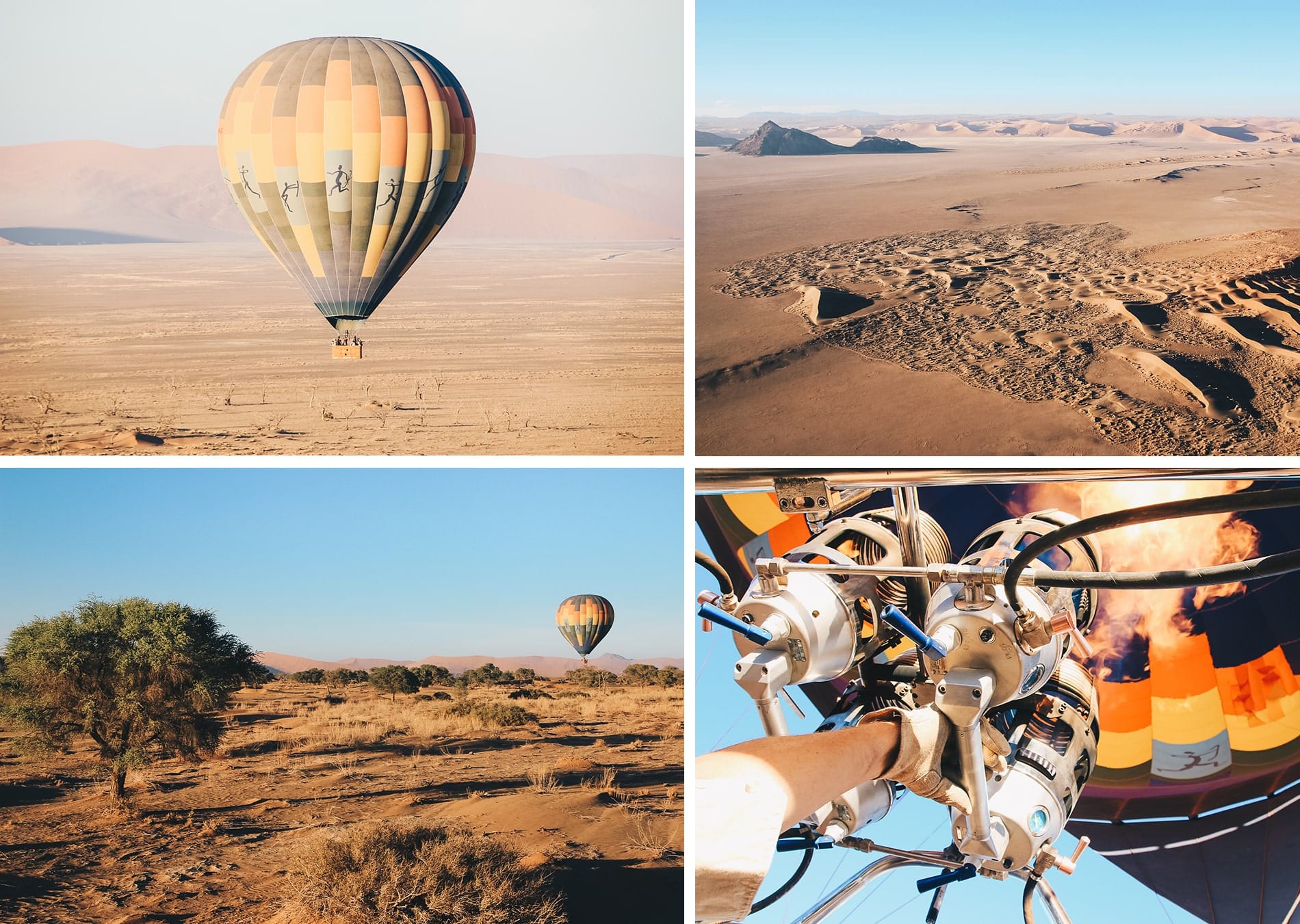 Unique et incroyable, ce sont souvent les mots qui reviennent pour décrire cette expérience magique. Le survol du désert en Montgolfière au lever du soleil a été un des souvenirs les plus spectaculaires de ce voyage. De retour sur terre, le petit-déjeuner de roi, sabré au champagne, au milieu du désert, est assez exceptionnel. Des paysages lunaires, des étendues arides et des dunes dorées vous attendent tout la haut. La montgolfière frôle le sol régulièrement pour pouvoir approcher les quelques animaux galopant dans le bush puis repart tout doucement vers le ciel. Il faudra vous lever très tôt pour faire ce vol d’une heure environ.