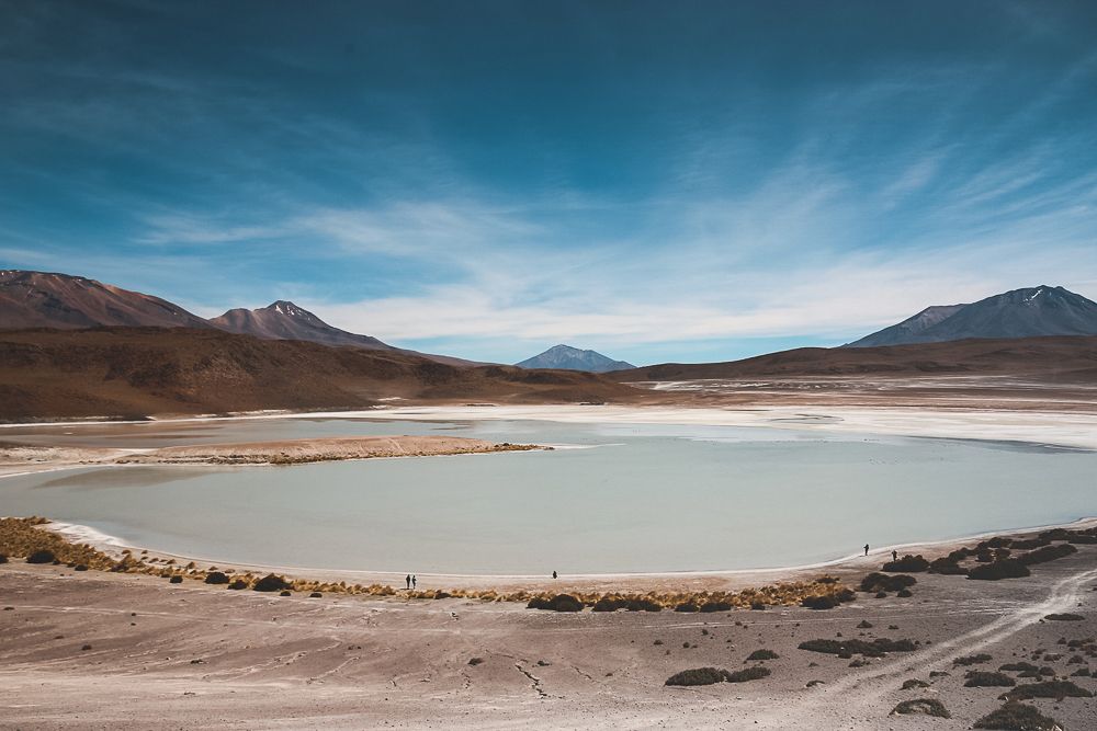 Nous voici donc partis pour la frontière bolivienne à 1h de San Pedro, c’est là que nous rejoignons notre chauffeur guide. Après un petit déjeuner au pied du 4×4 et 5 minutes de route, nous arrivons à la première lagune, la Laguna Blanca. C’est une pure merveille! Je dois dire que j’étais sans voix devant cette nature vierge, blanche et immense!