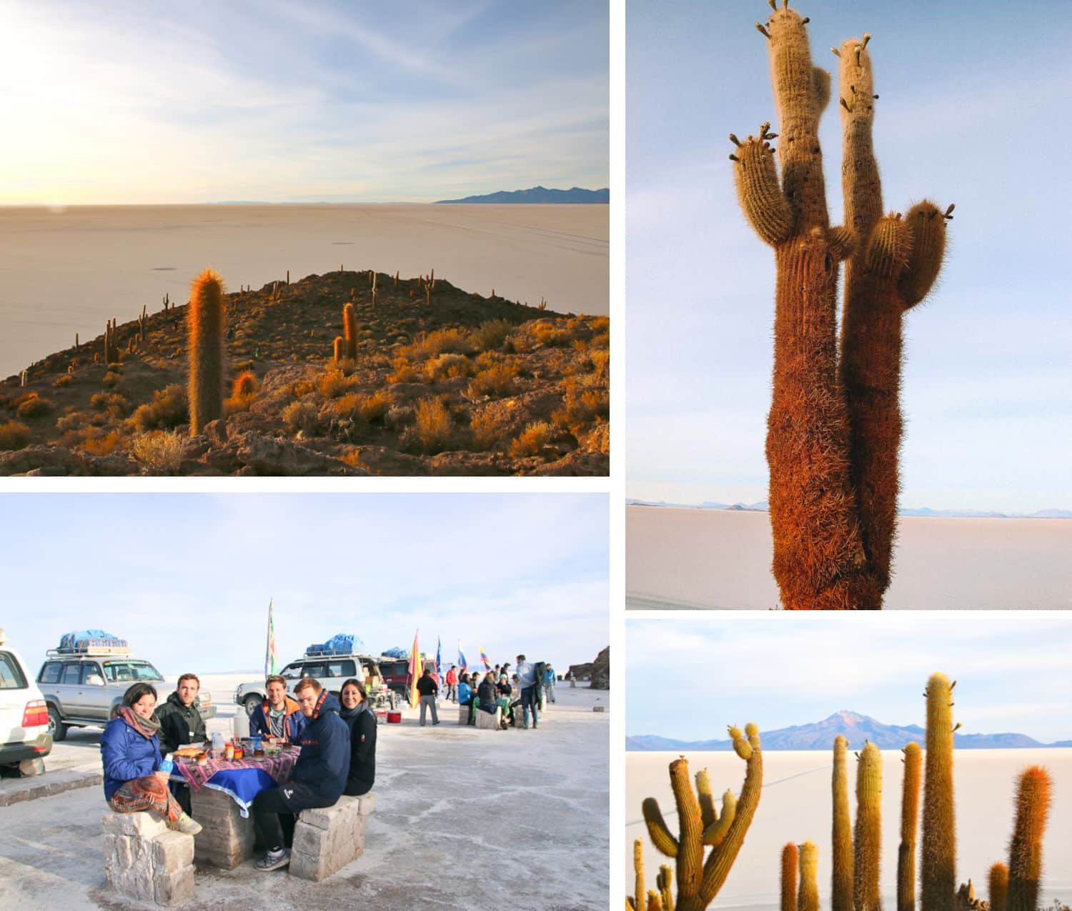 Malheureusement, notre chauffeur n’étant pas pressé, nous ne partons qu’à 5h10, bien après tout le monde et surtout après que celui-ci ait fini de faire le chargement des bouteilles de gaz, des bâches plastiques, de la nourriture…. et enfin de nos bagages! C’est ainsi que nous voyons les couleurs du lever du soleil évoluer doucement non pas sur l’isla Incahuasi, mais depuis la voiture. Passablement agacés et après s’être acquittés d’une taxe d’entrée de 30 bolivianos, nous grimpons difficilement et rapidement pensant 10-15 minutes la colline de l’île, ce qui nous provoque une toux lié à l’effort rapide en altitude. Nous arrivons enfin en haut…. juste après que le soleil ait percé! Une très mauvaise expérience donc et une déception énorme malgré un paysage somptueux sur une île remplie de cactus géant donnant un charme fou au lieu.