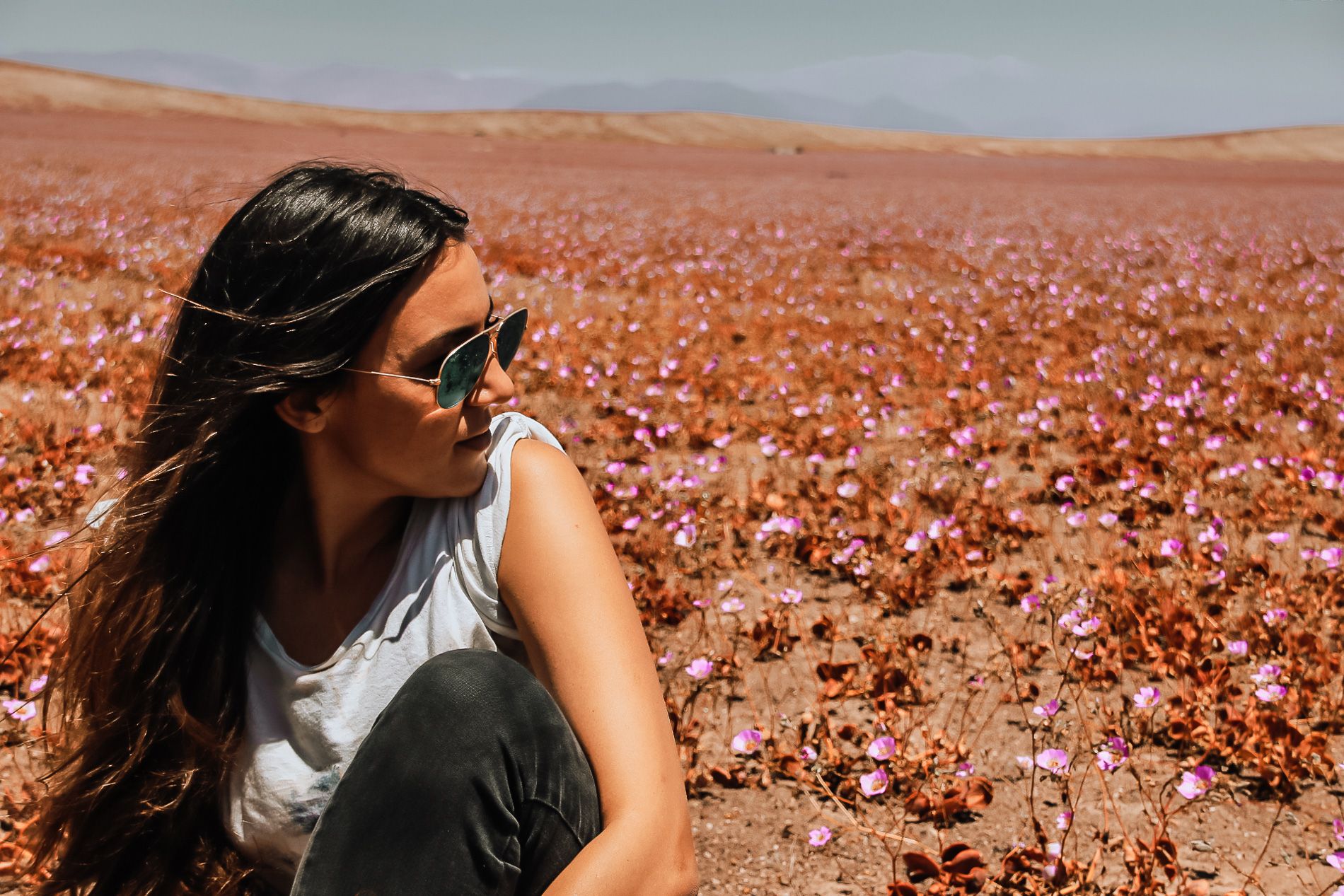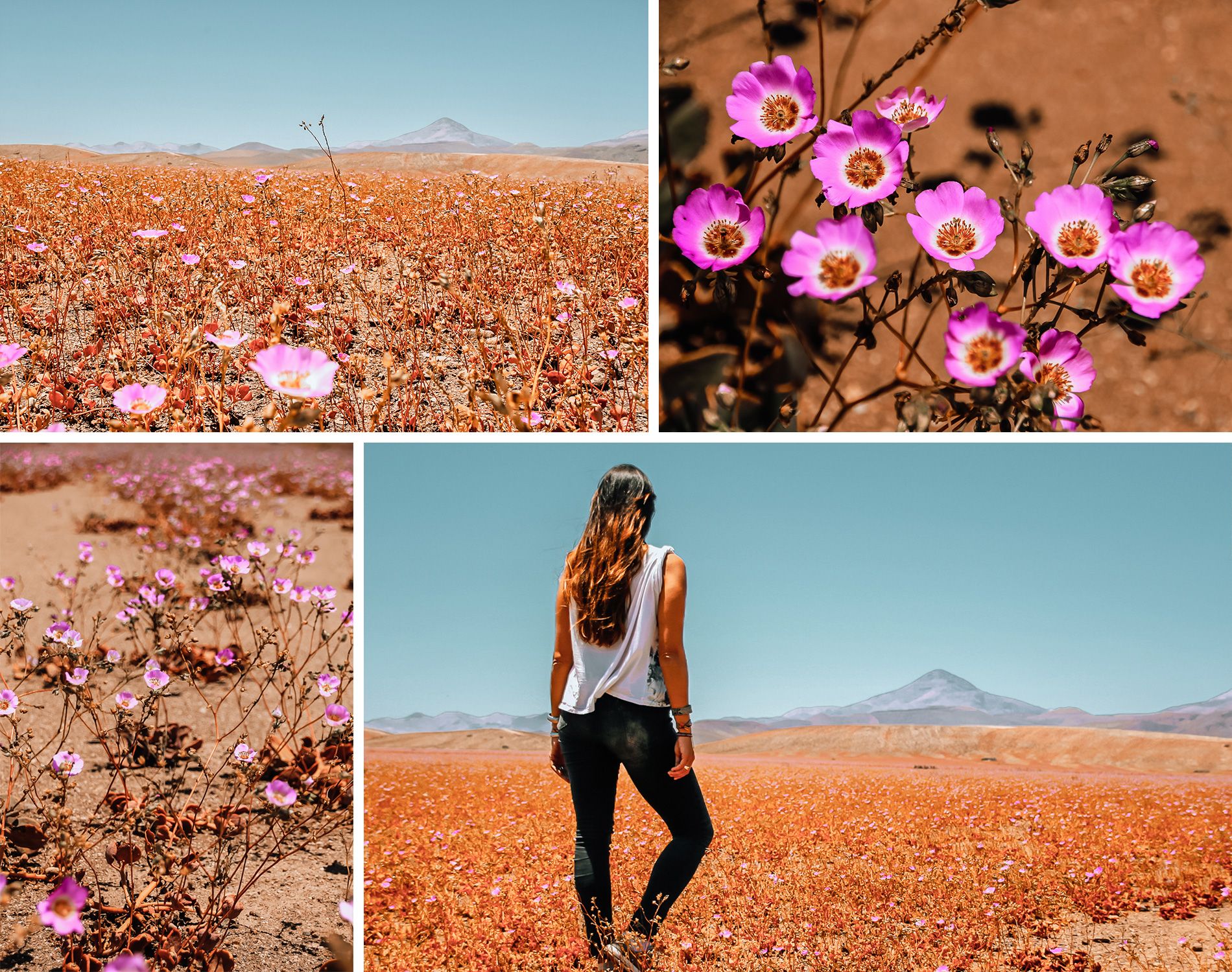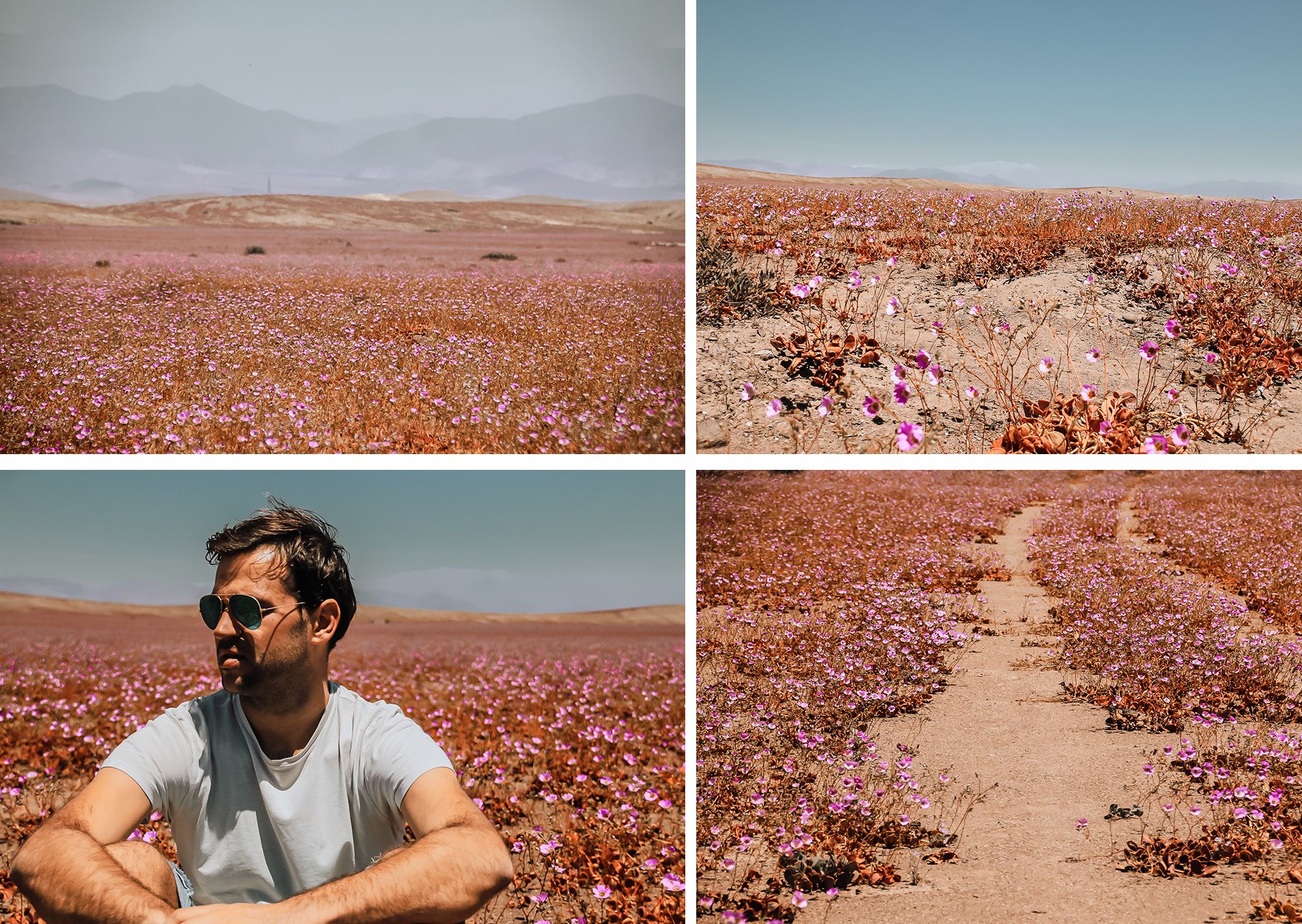 Pour voir le désert d’Atacama en fleurs, nous n’avons pas eu recours à une agence. Nous nous sommes tout simplement rendus sur le lieu puis nous avons fait du stop pour nous arrêter au bord de la route. Il n’y avait personne car les locaux y sont surement plus habitués que nous. Une fois sur place, on a emprunté un petit chemin puis on s’est posé dans le désert quelques heures. C’était si simple et magique en même temps. On remercie tout de même notre auberge pour nous avoir averti de ce phénomène.
