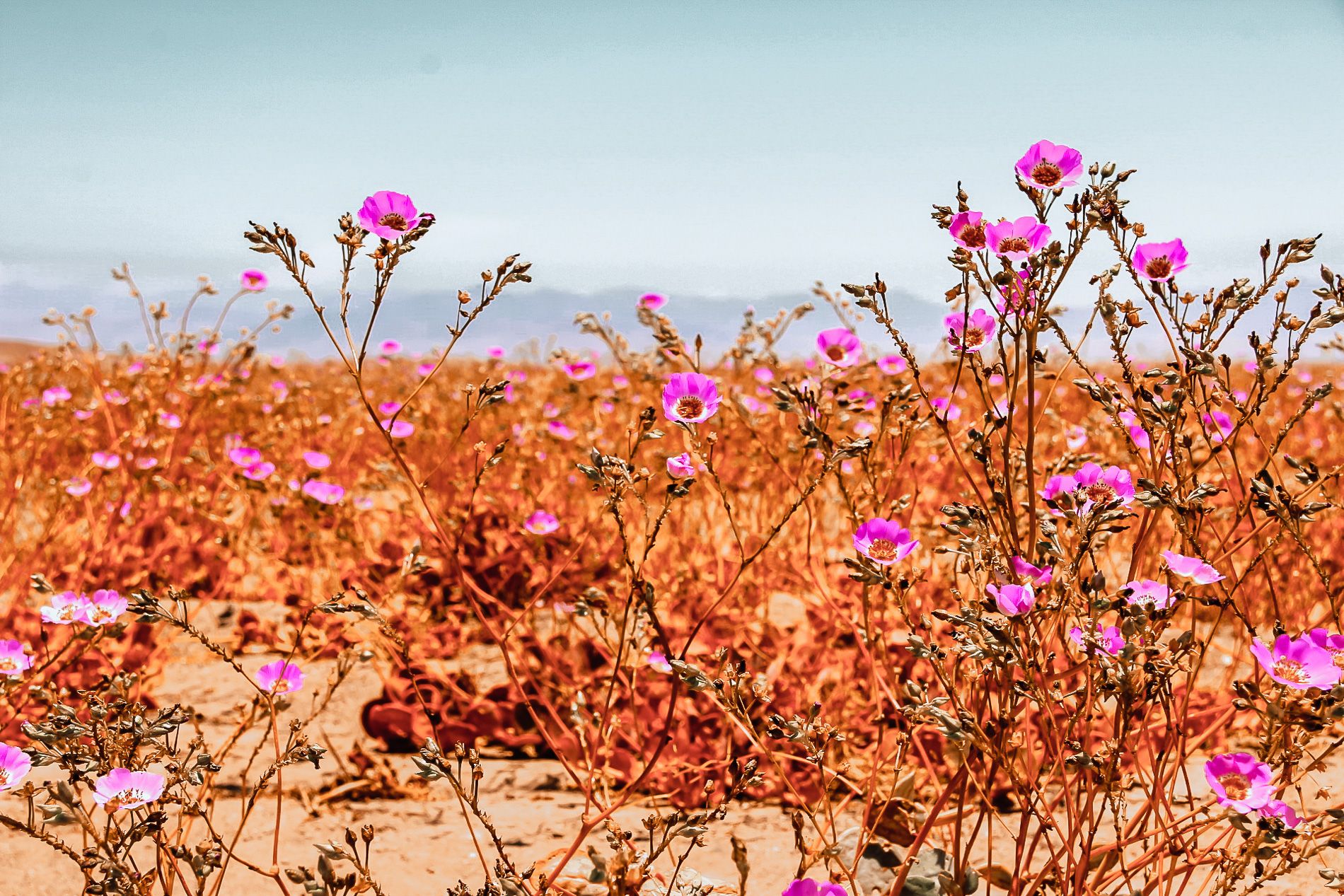 Quel spectacle incroyable, une multitude de fleurs colorées couvrent à perte de vue le sable. Elles étaient en septembre toutes blanches puis se sont transformées en fleurs jaunes, rouges, puis oranges, fushias et violettes. Le phénomène se produit tous les 5 ans voire tous les 10 ans et a atteint son apogée en 2015 , un événement spectaculaire que nous ne sommes pas prêts d’oublier!