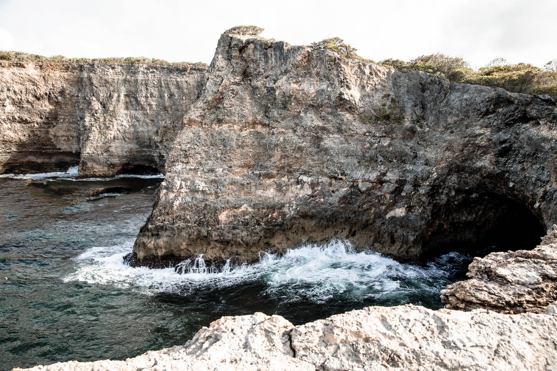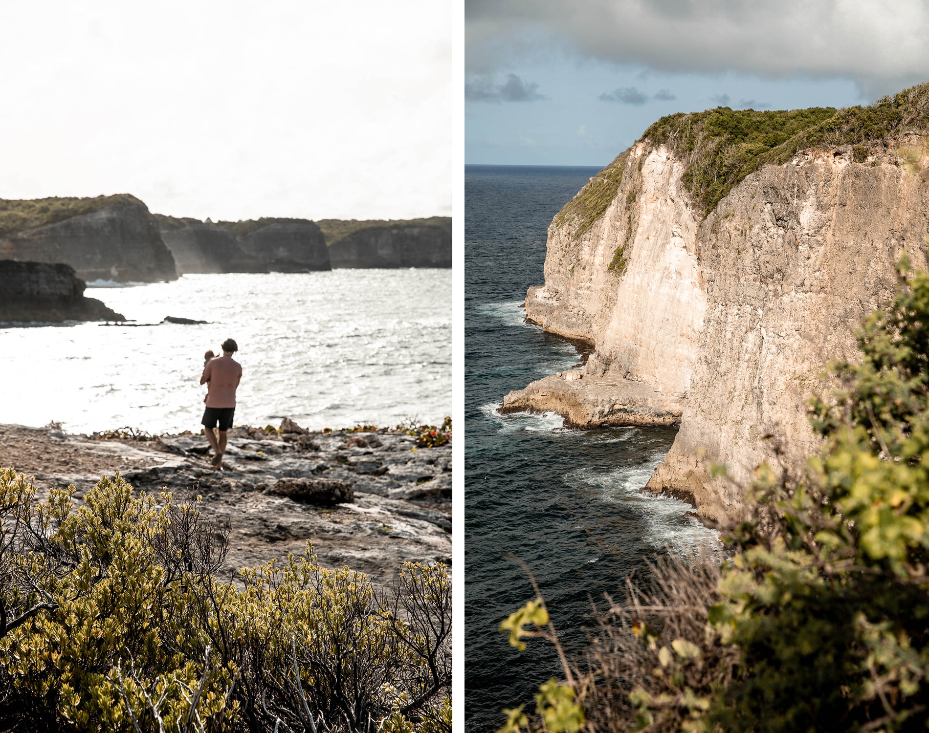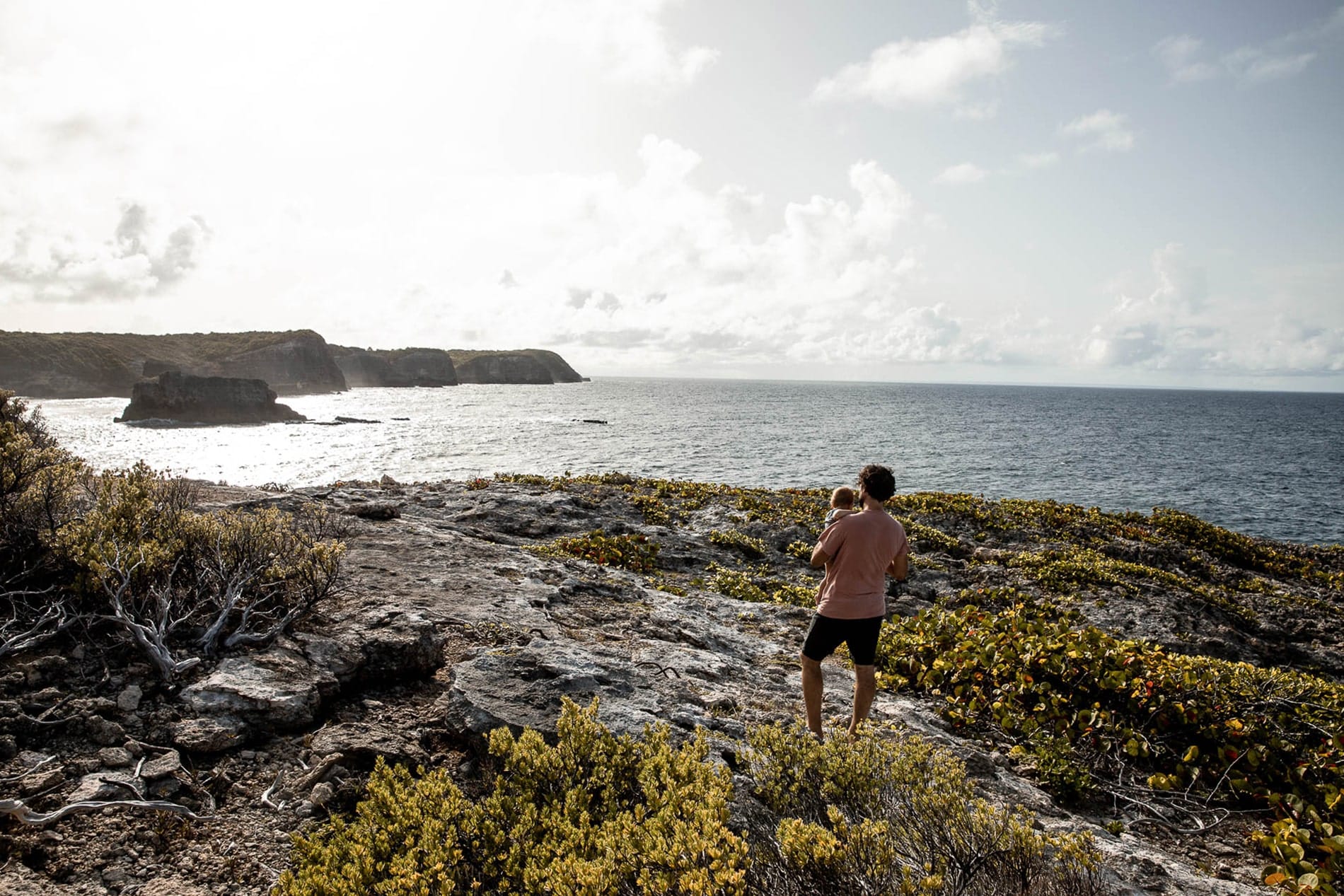 Plus au nord et plus spectaculaire, en direction de Saint-Louis, vous trouverez « Gueule Grand Gouffre ». A quelques pas du parking voiture et donc très accessible à pied, cette curiosité géologique est un impressionnant gouffre à ciel ouvert où les vagues de la mer se fracassent et offre un paysage époustouflant.  Et si vous êtes prêt à faire une petite randonnée sur des chemins un peu plus sinueux, le clou du spectacle des curiosités naturelles reste pour nous, la falaise et le site de Caye Plate juste à côté. Arrivés en milieu d’après midi avec Gabriel sur le dos, et au moment où les lumières deviennent plus chaudes, nous avons été comme enchantés par ce site caché, une petite pointe de terre surplombant la mer. D’un côté, vous serez au dessus d’une grande arche fracassée par la mer et de l’autre face à l’Océan. Un endroit idyllique et surprenant où nous avons été seuls  au monde!