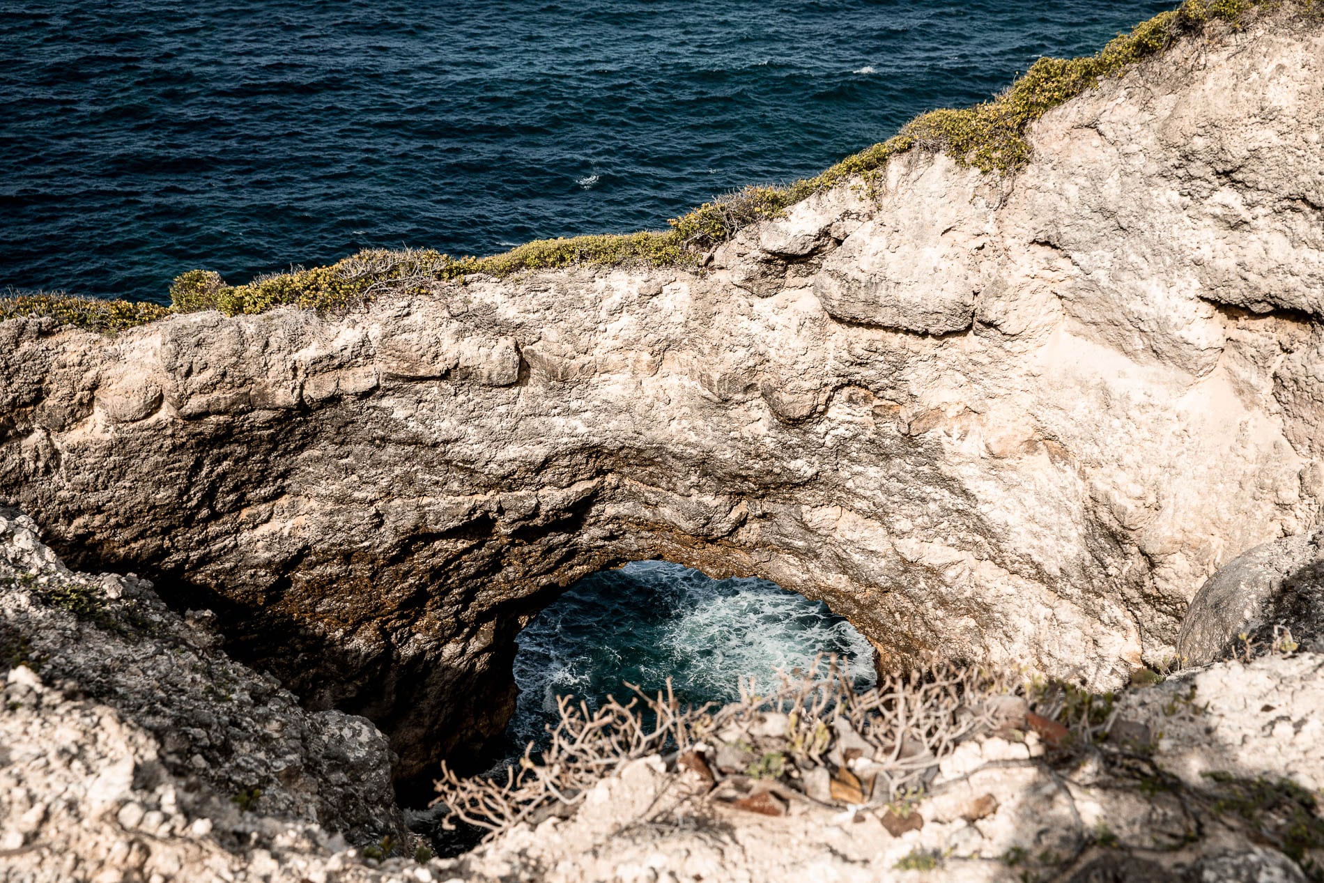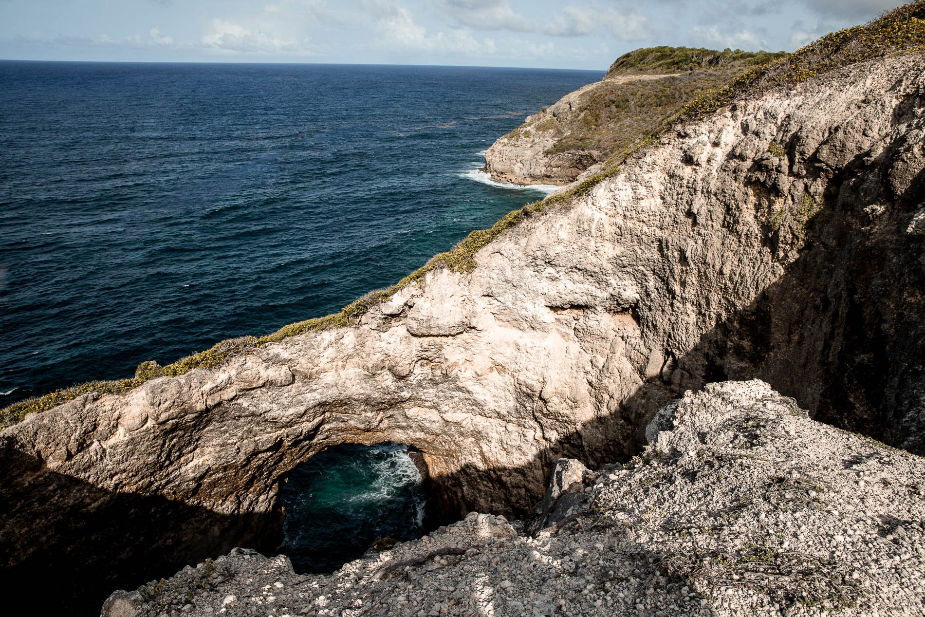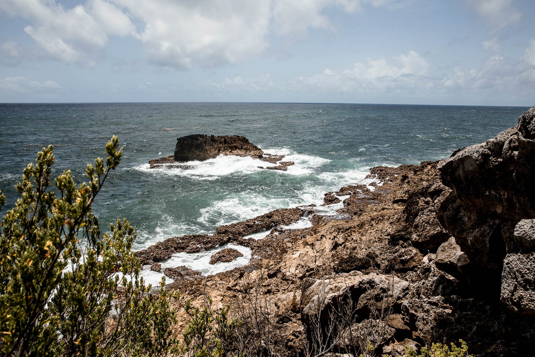 Plus au nord et plus spectaculaire, en direction de Saint-Louis, vous trouverez « Gueule Grand Gouffre ». A quelques pas du parking voiture et donc très accessible à pied, cette curiosité géologique est un impressionnant gouffre à ciel ouvert où les vagues de la mer se fracassent et offre un paysage époustouflant.  Et si vous êtes prêt à faire une petite randonnée sur des chemins un peu plus sinueux, le clou du spectacle des curiosités naturelles reste pour nous, la falaise et le site de Caye Plate juste à côté. Arrivés en milieu d’après midi avec Gabriel sur le dos, et au moment où les lumières deviennent plus chaudes, nous avons été comme enchantés par ce site caché, une petite pointe de terre surplombant la mer. D’un côté, vous serez au dessus d’une grande arche fracassée par la mer et de l’autre face à l’Océan. Un endroit idyllique et surprenant où nous avons été seuls  au monde!