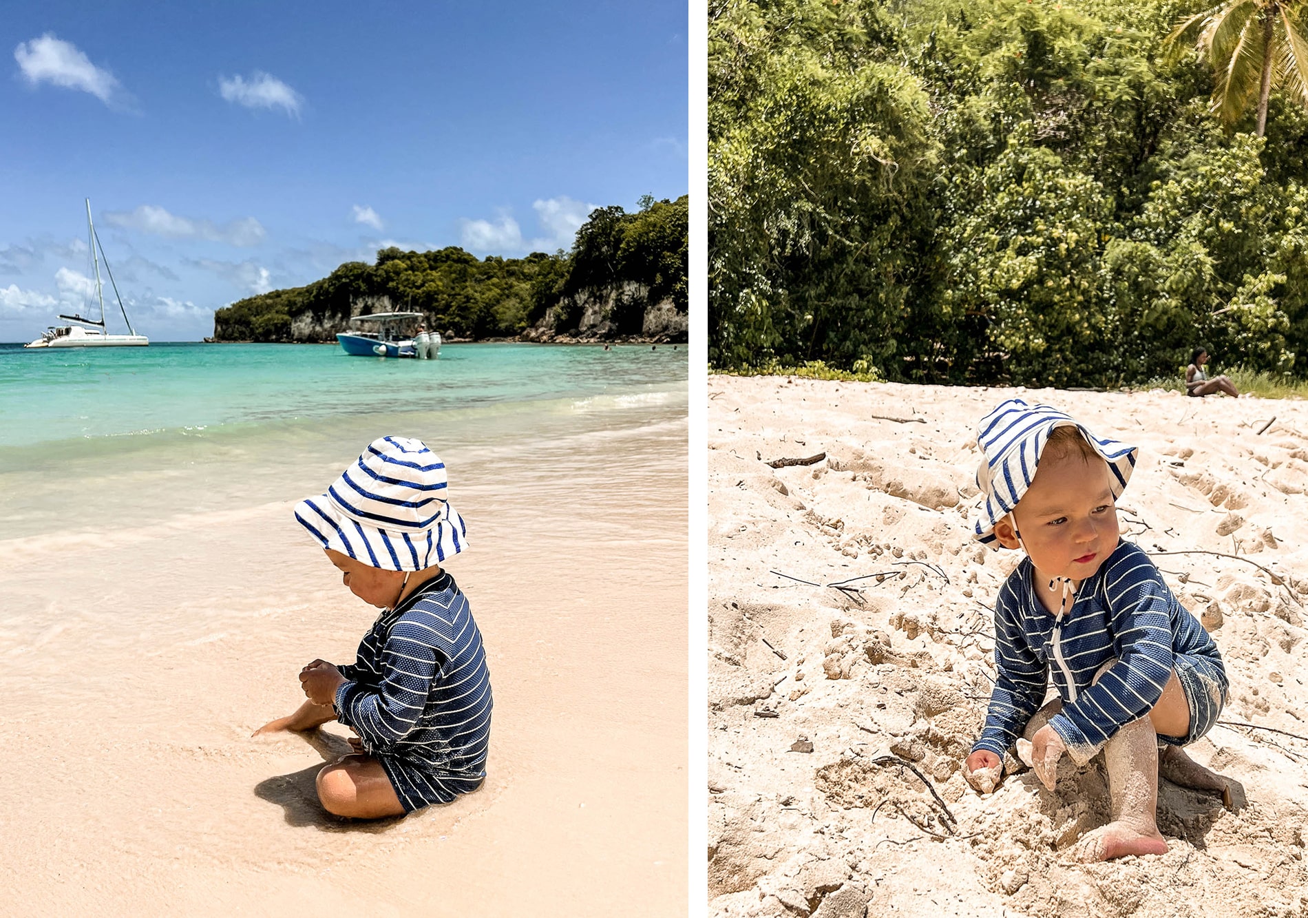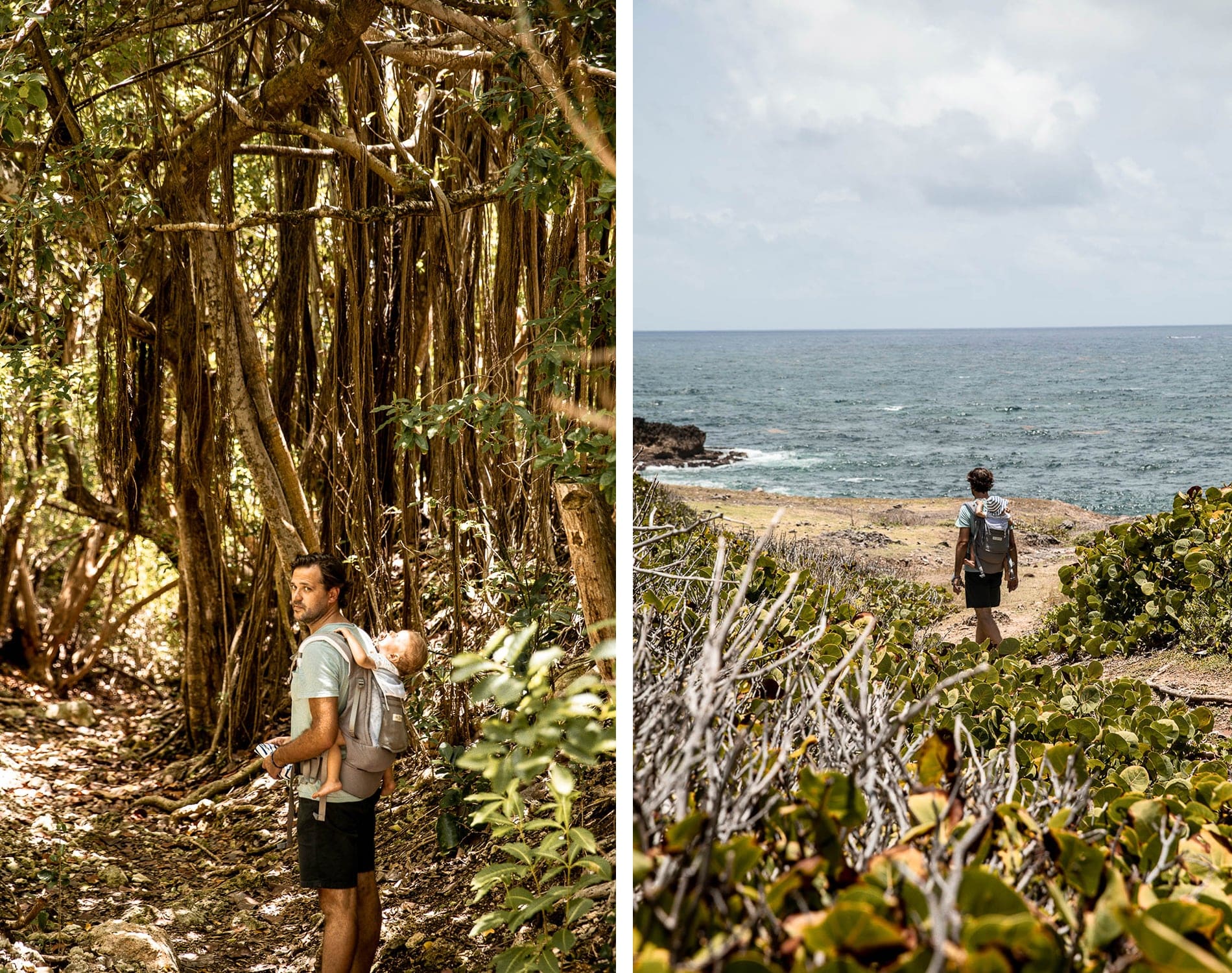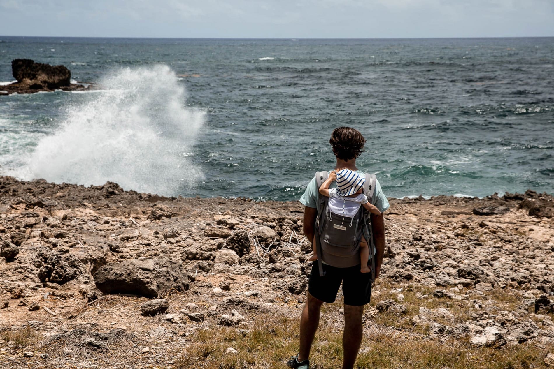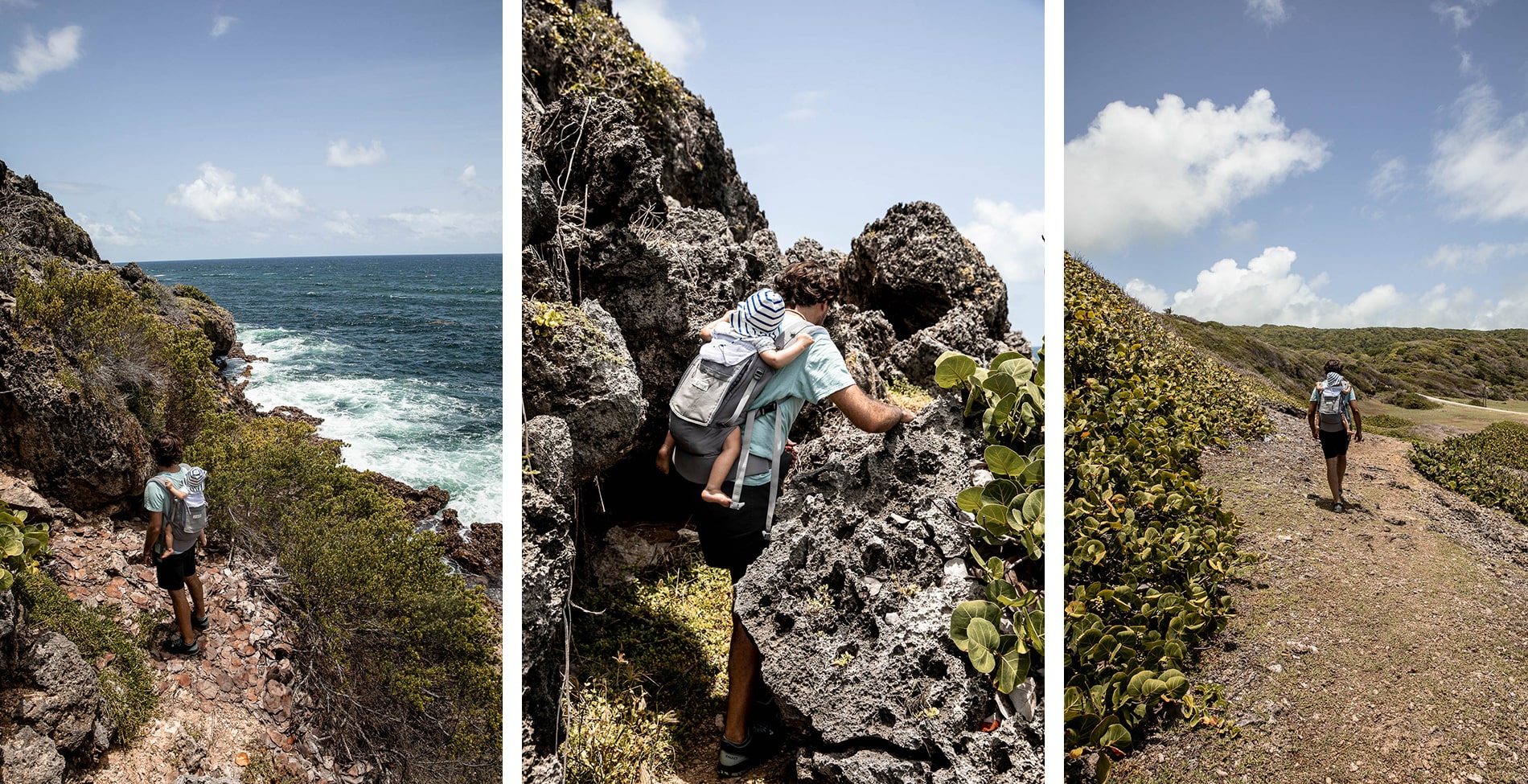 Pour commencer, direction Capesterre à MarieGalante pour le « sentier des galeries ». Une petite balade en bord de mer, de 45 minutes, sur un sentier qui vaut le détour de part les paysages contrastés. Elle débute par un passage en sous bois, avant de déboucher sur le bord de mer par une partie plus escarpée, qui nécessite de se faufiler entre les rochers. Mais rien d’effrayant, rassurez vous: c’est tout à fait faisable en famille à condition d’avoir le porte bébé et de bonnes chaussures pour éviter de glisser sur les rochers coupants.