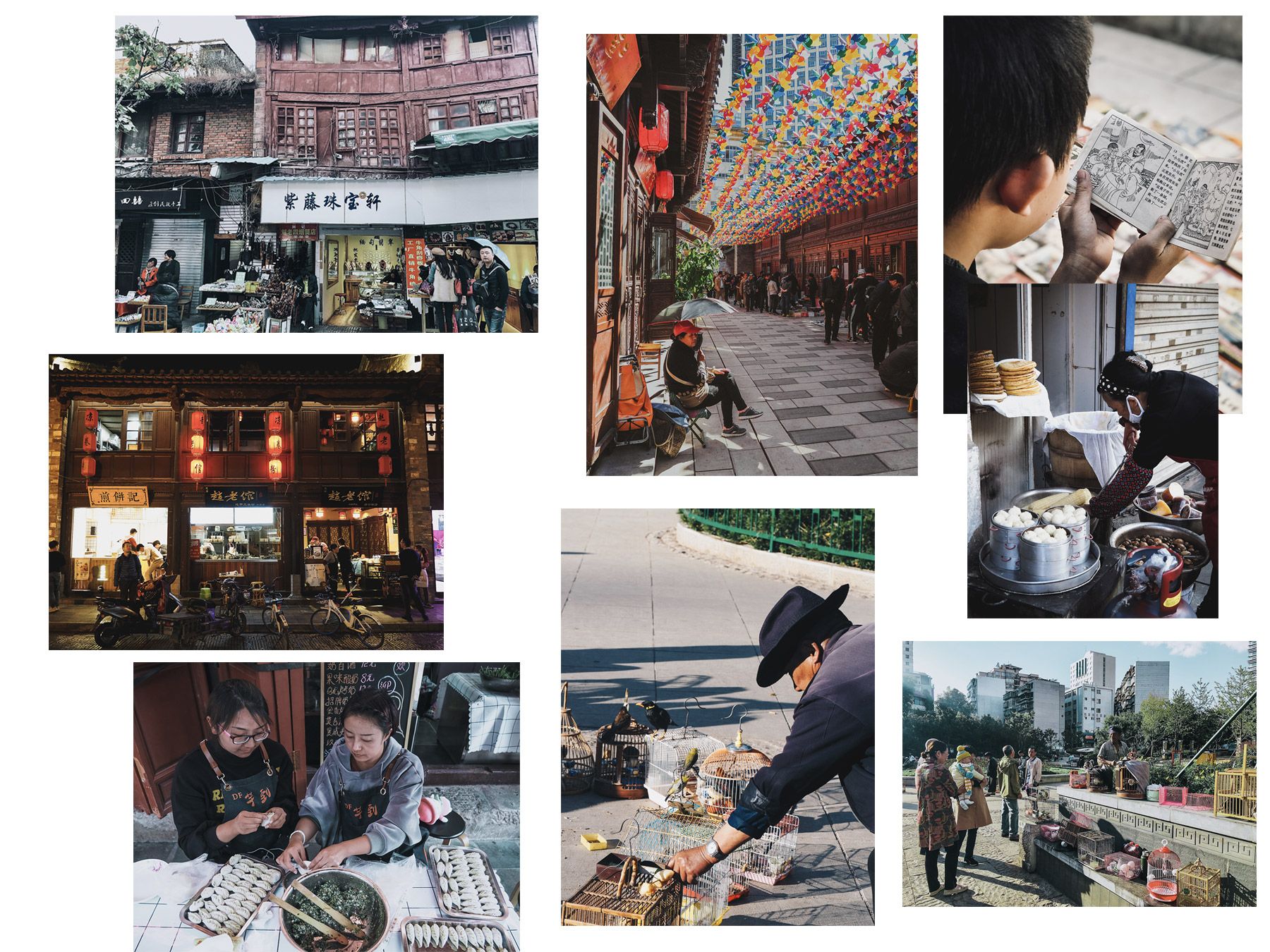 Nous n’y sommes restés qu’une journée mais le meilleur moyen de découvrir le vieux Kunming c’est de se lever très tôt pour y voir les vendeuses de petits-déjeuners chinois, les fameux Baozi, ces pains briochés à la viande, fumant sur le trottoir. Perdez-vous également dans les innombrables ruelles animées bourrées de charme, où se côtoient piétons et scooters électriques. Nous y avons trouvé un marché aux puces (ouvert de 9h à 18h tous les weekends) avec des brocanteurs installés sur le sol et des vendeurs de livres. Plutôt chouette! En arpentant la ville, nous nous sommes arrêtés dans un petit parc très charmant pour y contempler des scènes de vie authentiques où les locaux s’échangeaient des pigeons, des cages et autres petits oiseaux.
