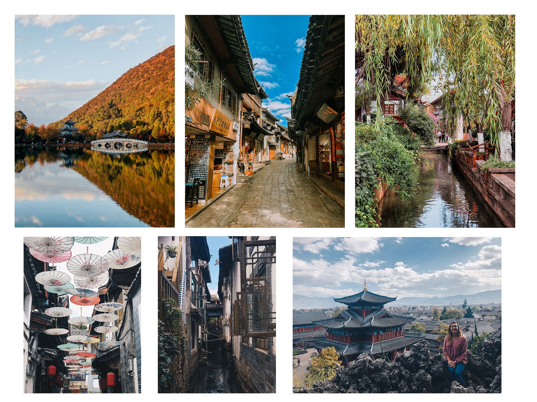 A 3h de route de Shangri-La se trouve Lijiang, avant dernière étape de notre voyage. La ville est connue pour son grand parc qui abrite un joli pont blanc chinois offrant une belle vue sur la montagne enneigée du Dragon de Jade. Allez-y en fin de journée pour le coucher de soleil sur le lac, les couleurs automnales y étaient magnifiques. La ville de Lijiang est classée au Patrimoine Mondial de l’Unesco. Au tout début en arrivant ici, je n’ai pas forcément aimé cette ville car j’ai eu l’impression que c’était une ville totalement crée pour le tourisme. Mais en m’enfonçant dans la vielle ville et en empruntant les petites ruelles perpendiculaires, j’ai commencé à me plaire ici. L’architecture est très typique et grisée, on trouve de nombreuses échoppes vendant un peu de tout et souvent la même chose: souvenirs, fruits, glaces, thés… Je vous conseille également de visiter le Mufu Palace qui se trouve dans la vielle ville, la vue est plutôt pas mal et les jardins assez zen et reposant.