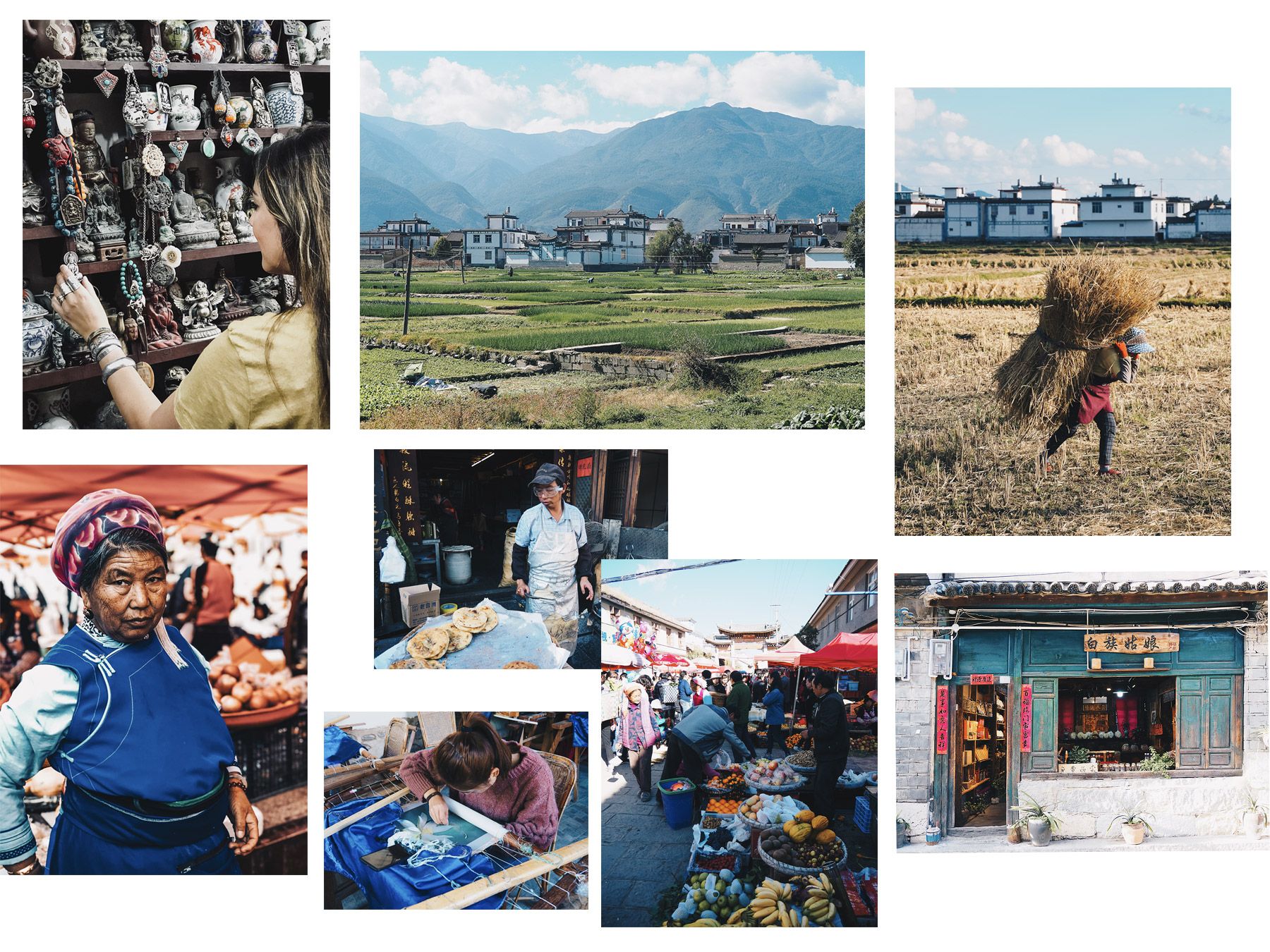 Après 4h de route route et 2h de train, nous avons posé nos valises dans le charmant village de Xizhou non loin de Dali. Xizhou c’est une étape encore une fois coup de cœur car le village est beaucoup moins touristique et prisé que la ville de Dali. Si on divise le village en deux, on trouve d’un côté de la place, un atelier de broderie sur fil de soie dans une petite ruelle cachée mais aussi un grand marché authentique qui grouille où l’on vient flâner pour acheter du poivre de Sichuan, des épices, des fruits et légumes mais aussi des bijoux en argent. Puis de l’autre côté, une fois passé la jolie place et l’arche chinoise, on découvre une partie de la ville plus moderne mais en même temps traditionnelle, avec une longue ruelle pavée abritant des petits coffeshop mais aussi des boutiques absolument bien décorées, vendant des produits locaux et naturels, des parfums d’ambiance et des souvenirs. Xizhou est un petit havre de paix qui mérite une pause de quelques jours. Nous en avons profité pour emprunter les vélos de notre hôtel et nous rendre autour du Lac, découvrir la campagne avoisinante et des petits villages sous un beau soleil.