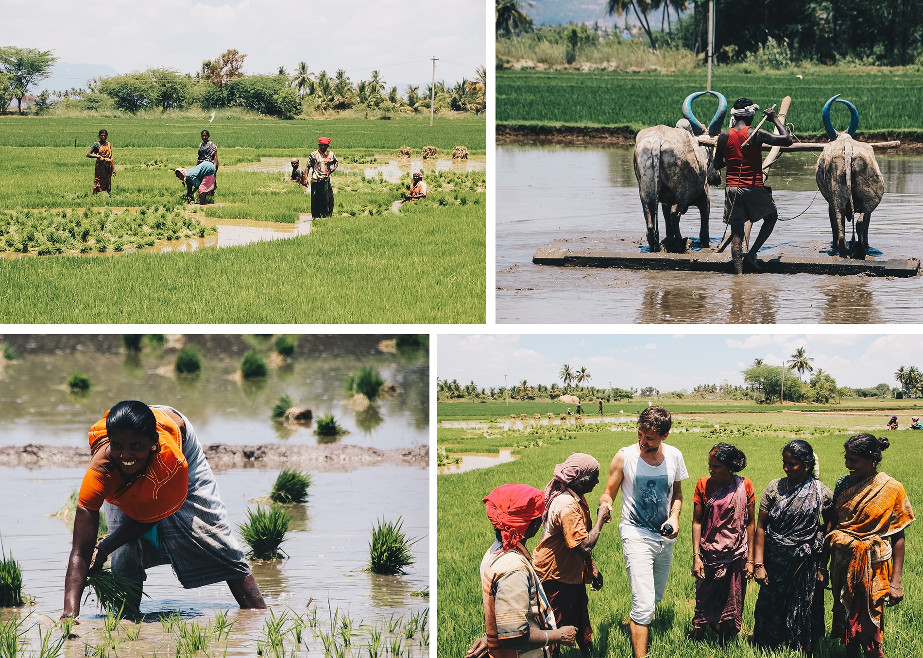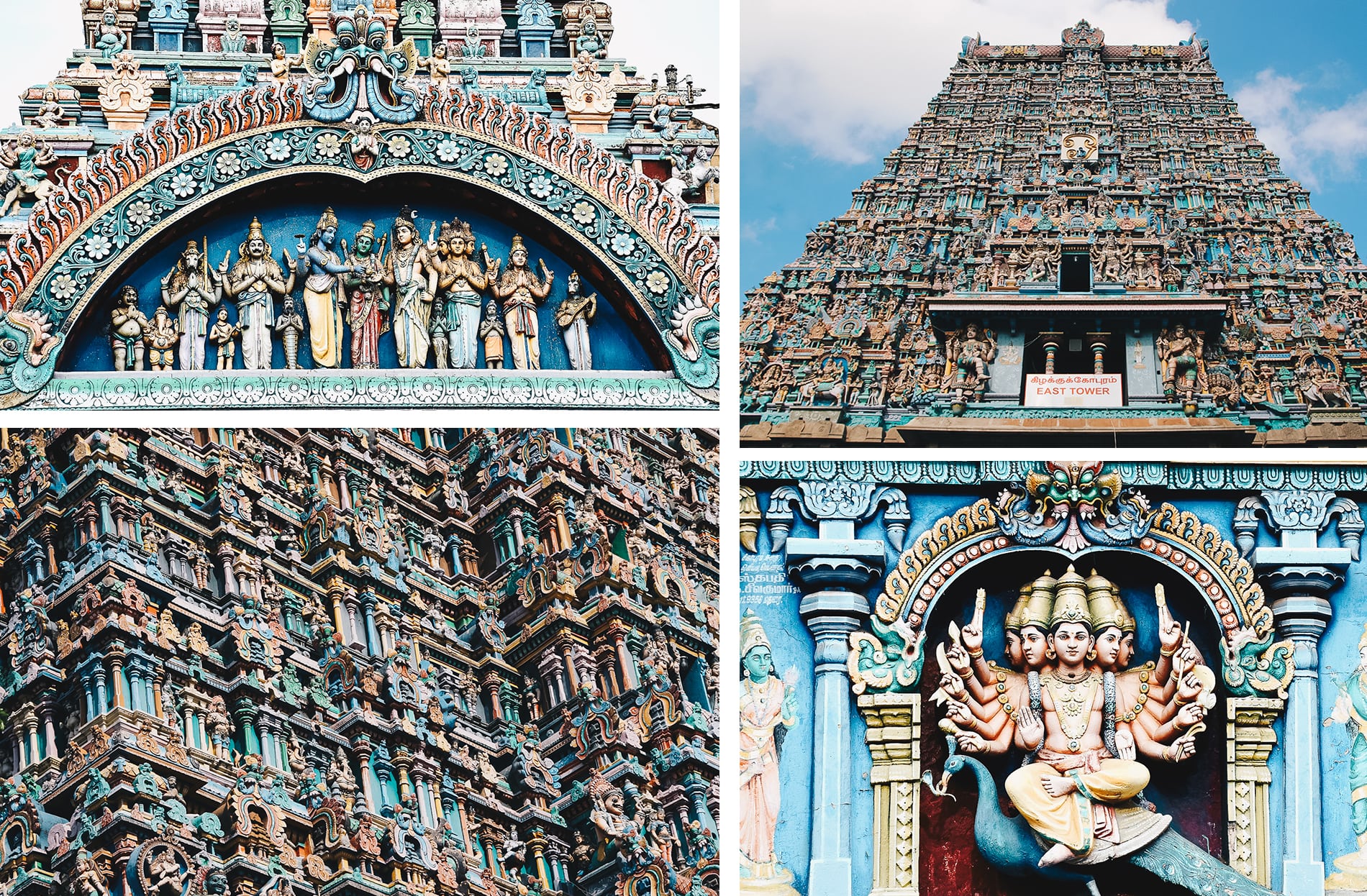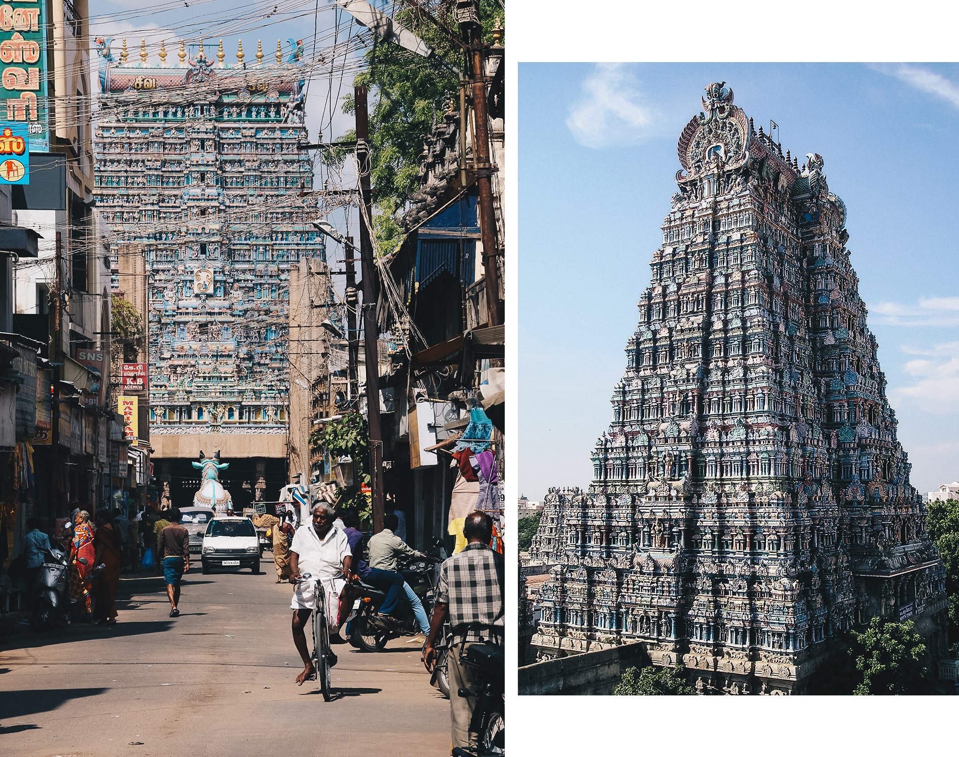 Nous sortons le temps d’une journée du Kerala pour aller visiter Madurai, la capitale culturelle du Tamil Nadu. La route qui mène au Tamil Nadu est très belle, bordée par les rizières et animée par les scènes de vie. L’occasion pour nous de nous arrêter en bord de route et d’échanger les locaux. La ville de Madurai est connue pour son temple original, « Sri Meenakshi » situé en plein cœur de la ville, très coloré et célébrant notamment le Dieu Shiva. Celui-ci est quasi tout bleu et orné de nombreuses statues. Il est incontournable avec ses 11 tours dont 4 qui mesurent 60 mètres de haut. Attention Les caméscopes et les appareils photo sont interdits à l’intérieur, tenue correcte exigée, pas de short, pas de jupe court, pas d’épaules découvertes.