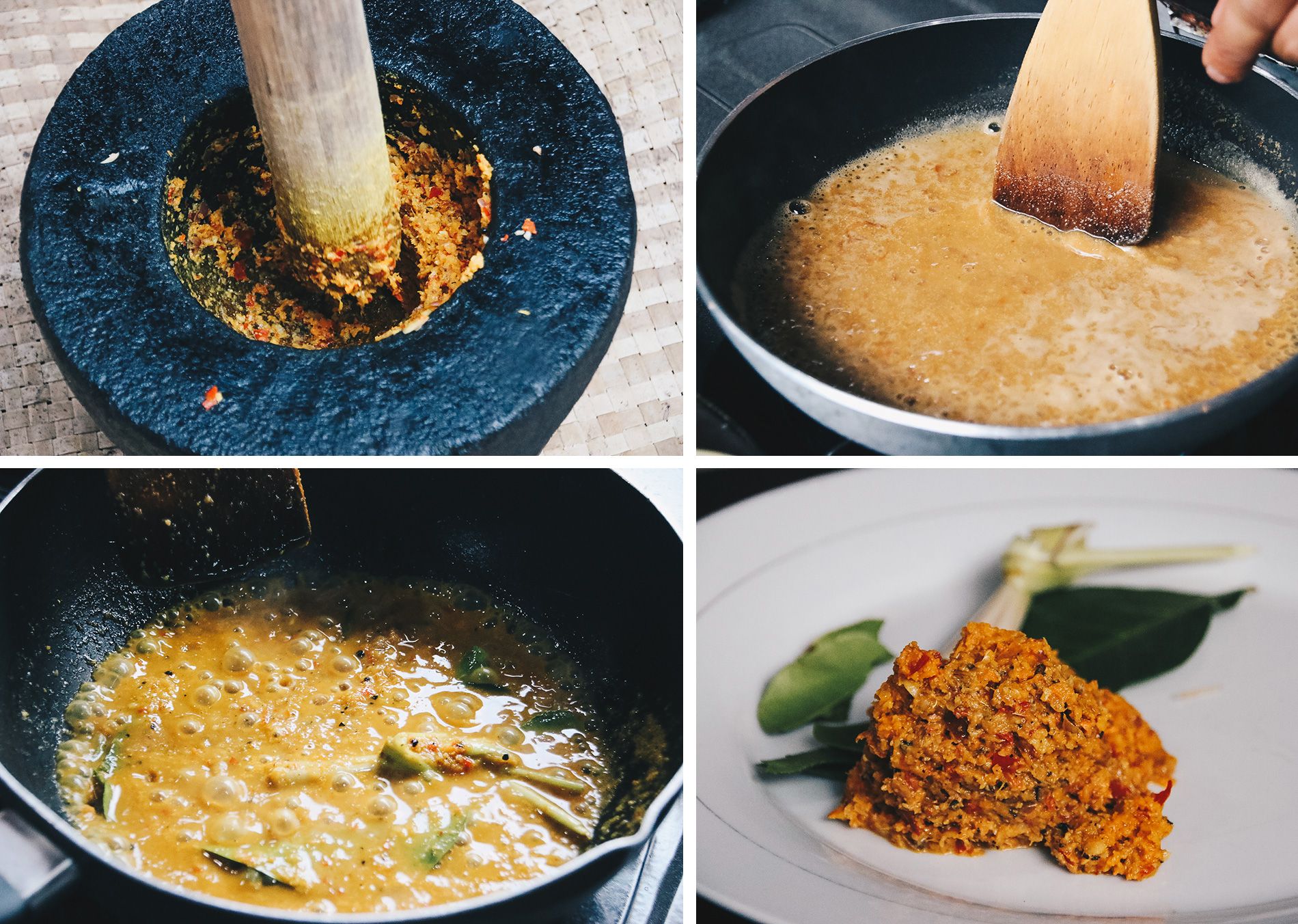 - Faites revenir dans un poêle avec l’huile,la pâte obtenue 7 minutes à feu doux puis le bâton de citronnelle, les poivres, le sucre, et salé.