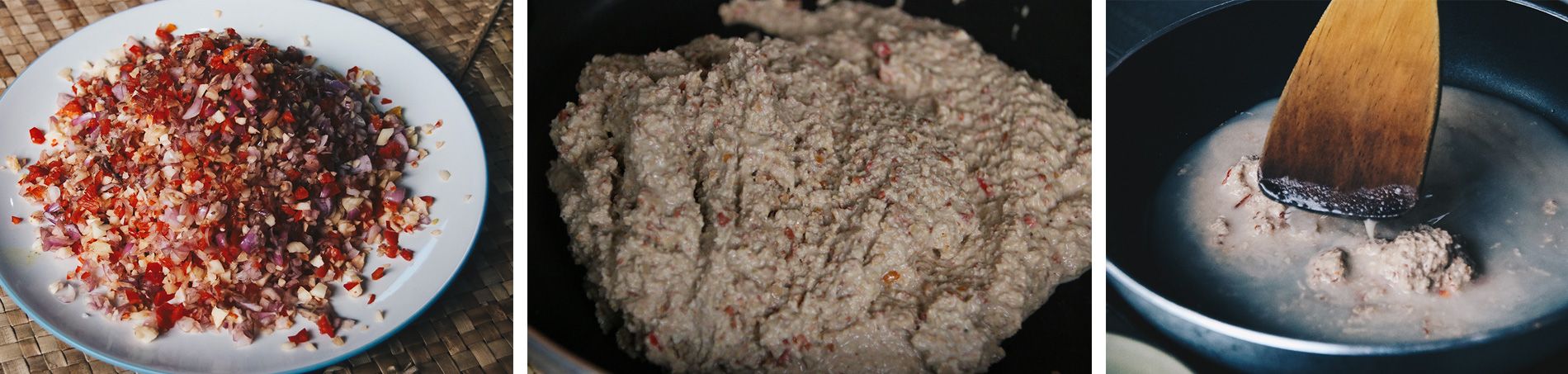 - Passez au blender les cacahuètes, l’ail, le galanga, le piment et la tomate de manière à obtenir une pâte fine.