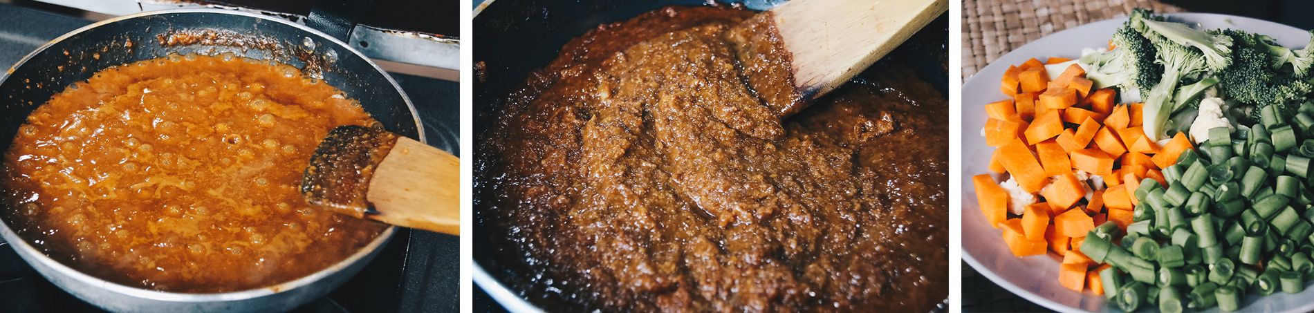 Vous allez maintenant vous lancer dans la préparation du Gado Gado qui signifie « Mix Mix ». Cette salade végétarienne est aussi un grand classique de la cuisine indonésienne! Le gado-gado est une spécialité culinaire, considéré comme un plat principal, consistant en une salade de divers légumes blanchis ou cuits à la vapeur, accompagnés d’oeufs durs, de pommes de terre bouillies, de tofu et tempeh frits, le tout nappés d’une sauce piquante aux cacahuètes. Vous ne pourrez pas y échapper lors d’un voyage en Indonésie.