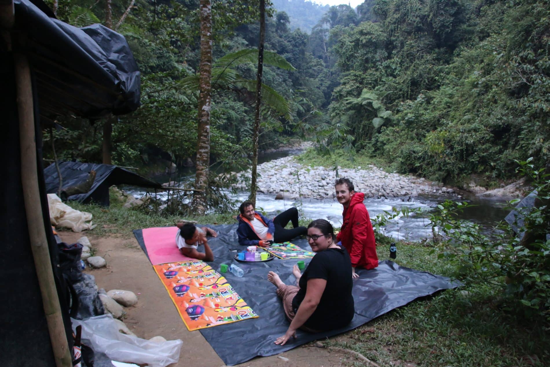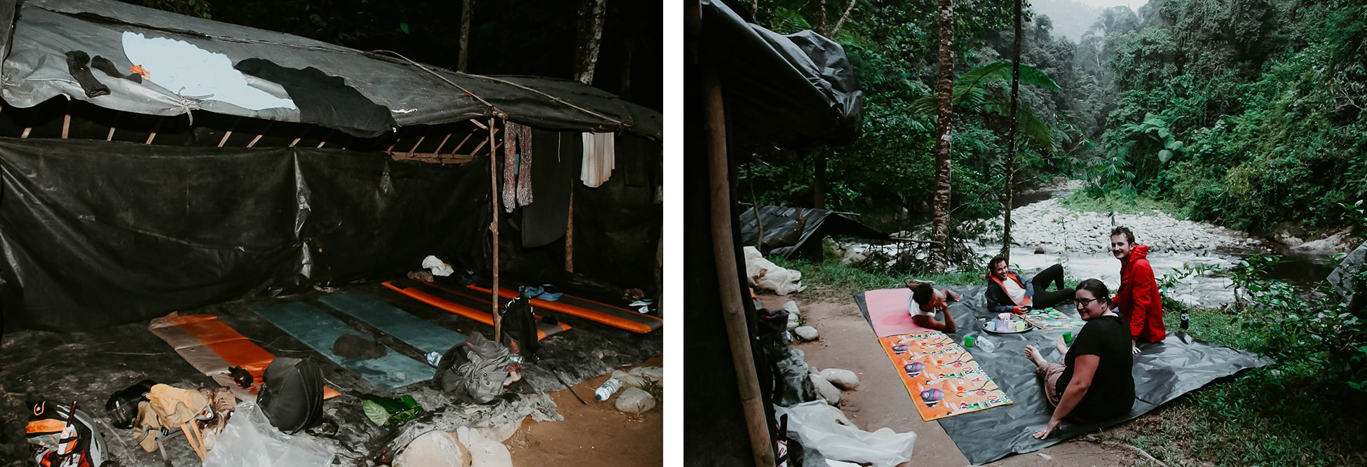 Nous sommes partis en direction de la rivière pour nous rafraîchir puis nous avons dîné tôt car la nuit tombe rapidement dans la jungle. Nous avons dormi dans un camp en bois surélevé, pouvant accueillir une dizaine de personnes. Il était protégé par des bâches en cas de vent et de pluie, et fournissait matelas fins, draps et couvertures pour être bien isolés du sol et se protéger du froid la nuit. Une expérience simple mais magique, bercée par les sons de la jungle.