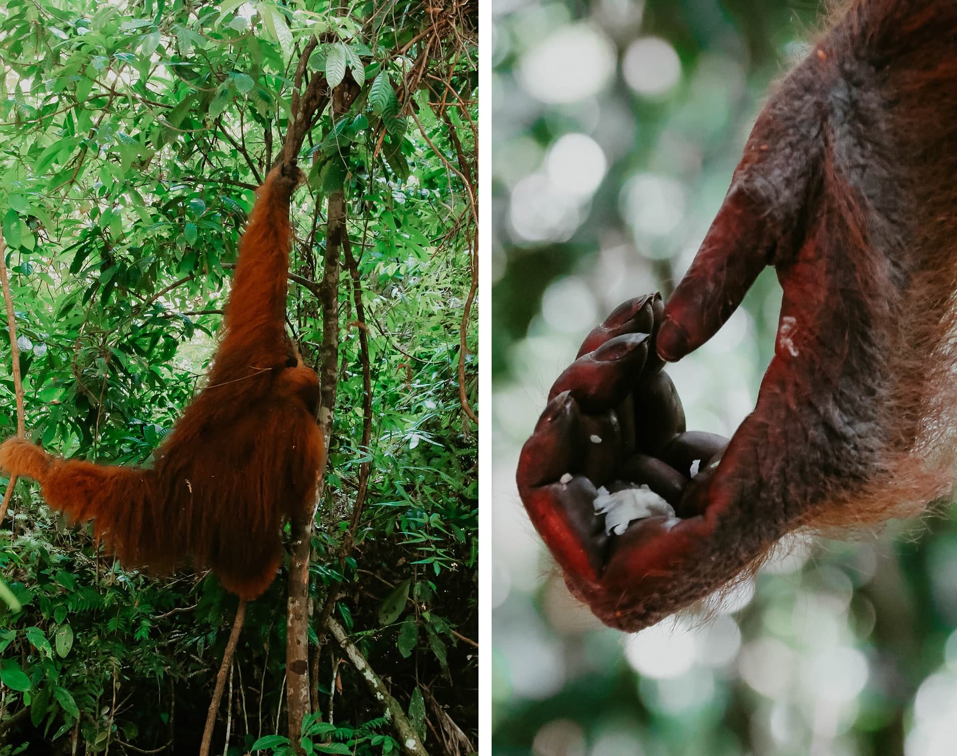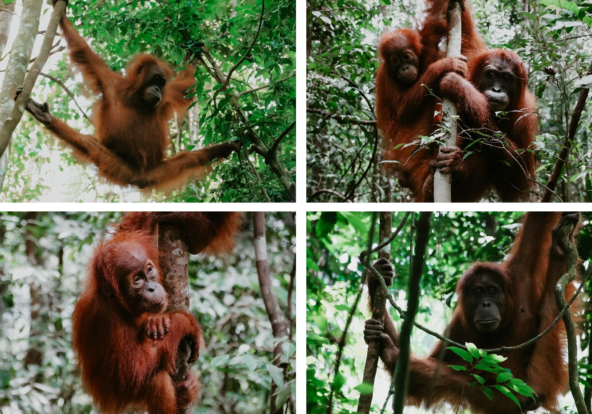 Puis d’autres orangs-outans ont suivi, cette fois des femelles avec leurs bébés, curieuses et espiègles, qui se sont approchées de nous. Un moment que nous ne sommes pas prêts d’oublier. Nous ne savions plus où donner de la tête, alors nous nous sommes posés un instant et avons apprécié le spectacle devant nous! L’agilité de ces primates était impressionnante: les orangs-outans se balançaient d’une branche à l’autre, s’agrippaient tantôt avec une main, tantôt avec le pied, s’étirent en grand écart, s’approchant de nous tout en nous regardant dans le blanc des yeux! En indonésien, Orang outan signifie « homme de la forêt » et vous comprenez pourquoi. Leurs gestes, leurs regards, leurs expression, tout rappelle combien notre ADN est si proche : 96,7 % de similitude avec l’être humain.