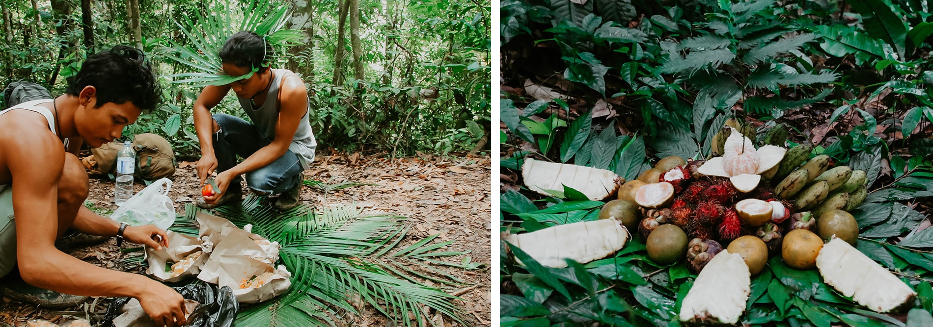 Émus par ce spectacle, nous avons poursuivi notre trek et avons décidé de faire une pause déjeuner par terre, non loin d’un immense arbre centenaire! Les guides étaient au petit soin pour nous et avaient préparé un repas copieux et local: le traditionnel Nasi Goreng servi dans une feuille de bananier et accompagné d’une multitude de fruits tropicaux. Un moment magique jusqu’à ce que deux femelles gourmandes et affamées ont tenté de nous voler notre repas à deux reprises. Mais que d’émotions, je m’en souviens encore ! Je ne sais pas vous mais pour nous, c’était la première fois que nous nous faisions courser par des primates affamés! Drôle de sensations!