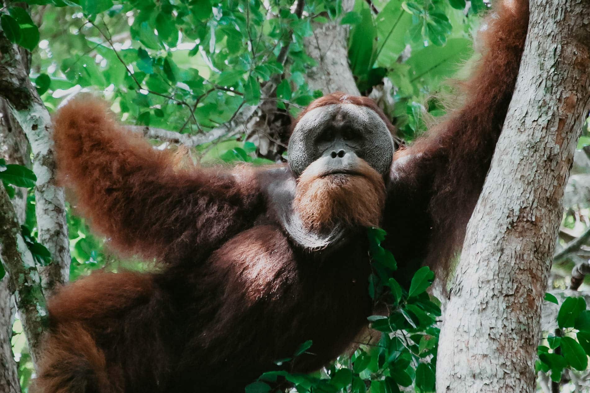 Premier orang-outan aperçu à peine rentrés dans le parc national. C’était une belle bête, un mâle d’environ 100 kg perché à quelques mètres de nous, suspendu avec agilité à sa branche. Impressionnant, majestueux, presque humain.