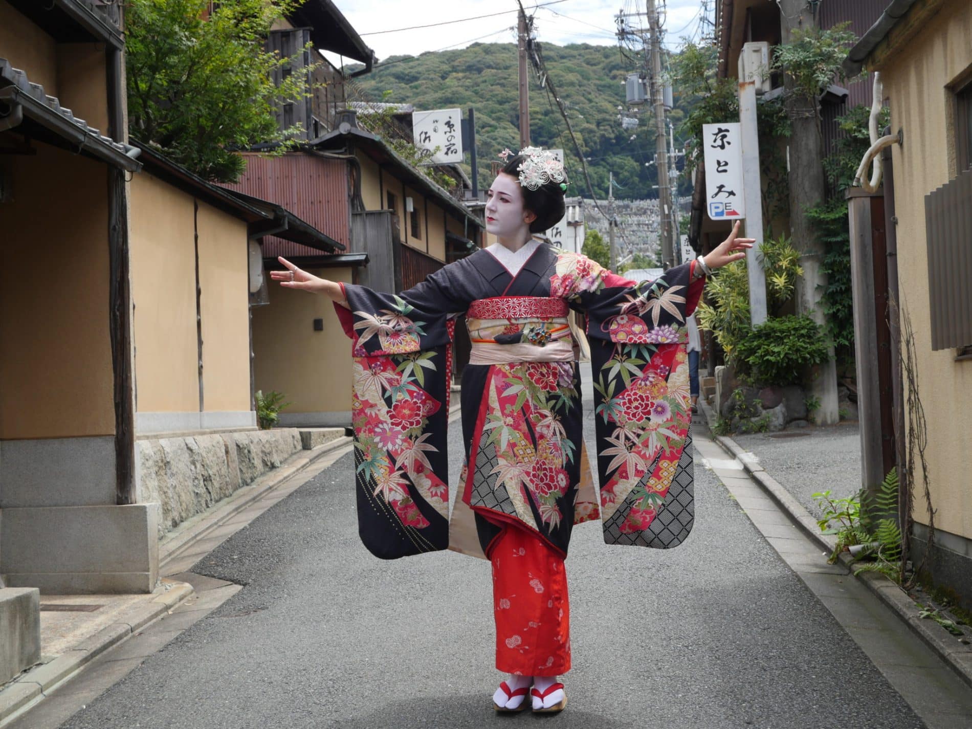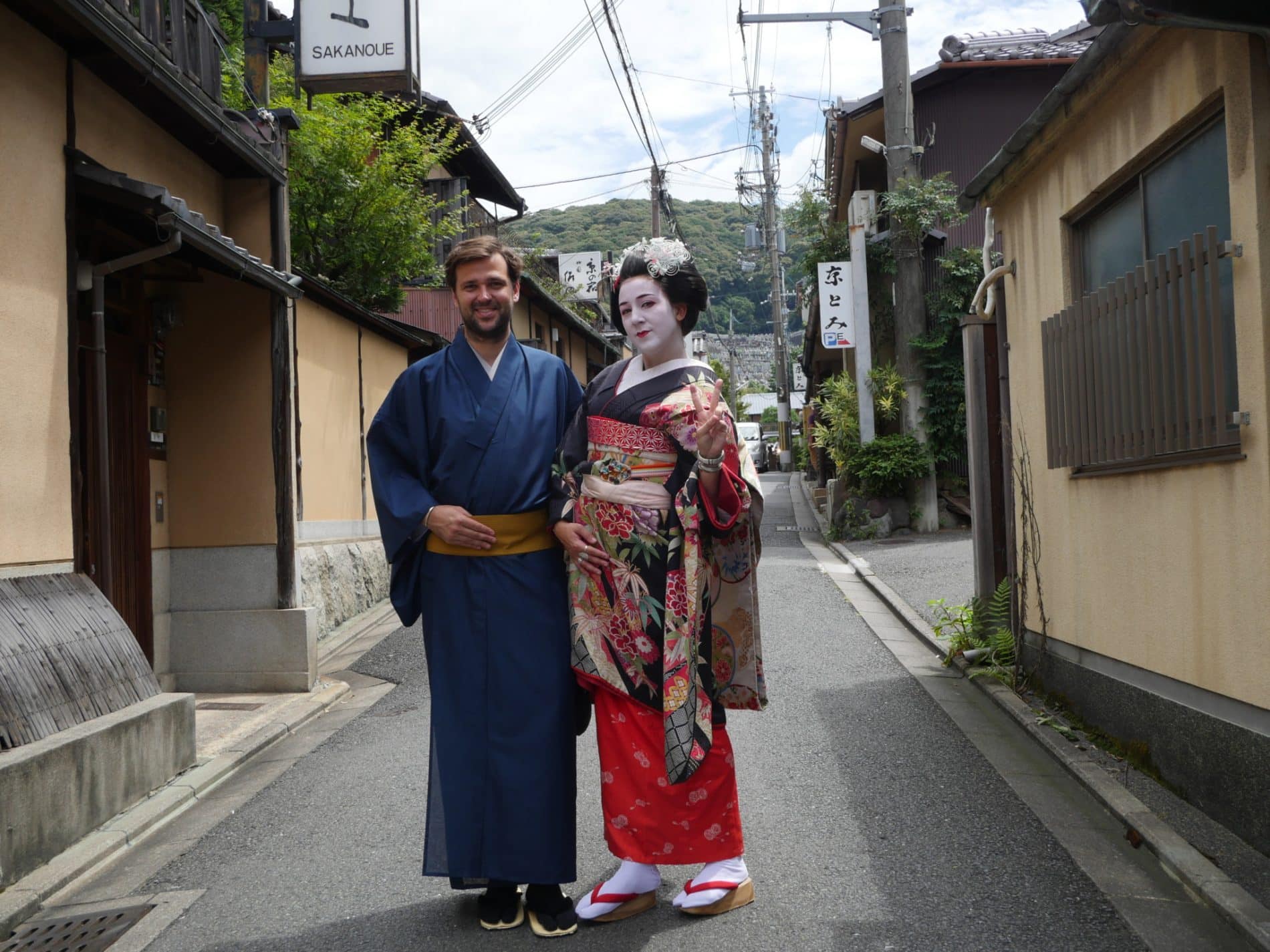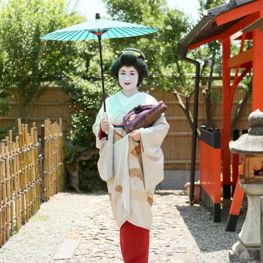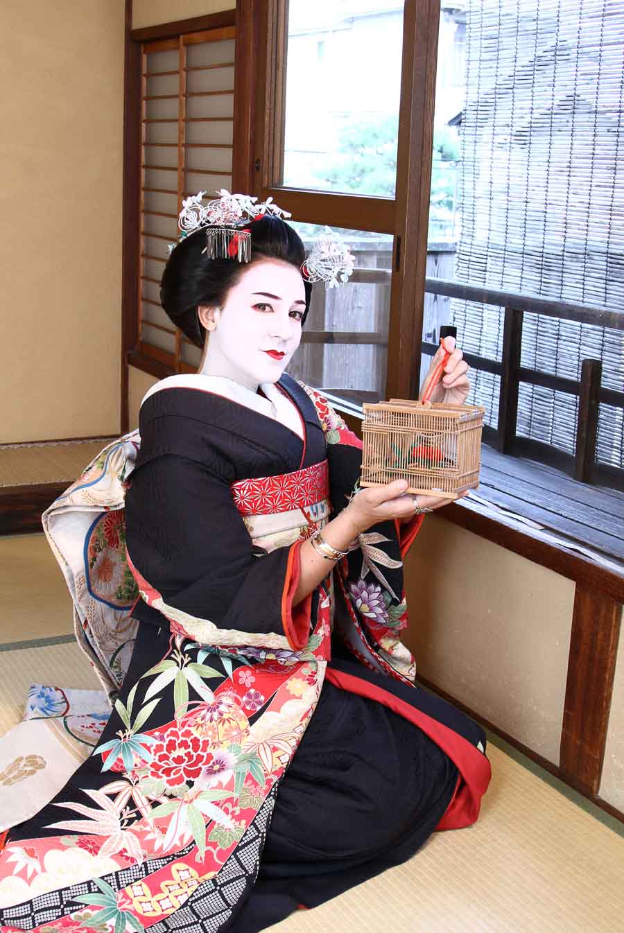 C’est à Kyoto et plus particulièrement dans le quartier traditionnelle de Gion que j’ai trouvé une maison proposant ce type de transformation. Les Geishas dont le nom provient de gei qui signifie art et sha qui signifie personne sont des femmes raffinées d’excellente compagnie et réservées à une clientèle très aisée. La geisha sait par sa culture animer un dîner pour plusieurs invités.Les Maikos quant à elles sont de jeunes apprenties geishas qui accompagnent et qui assistent les geishas dans les maisons de thé, les réceptions et les banquets, apprenant le port du kimono, l’art de la conversation et du divertissement.