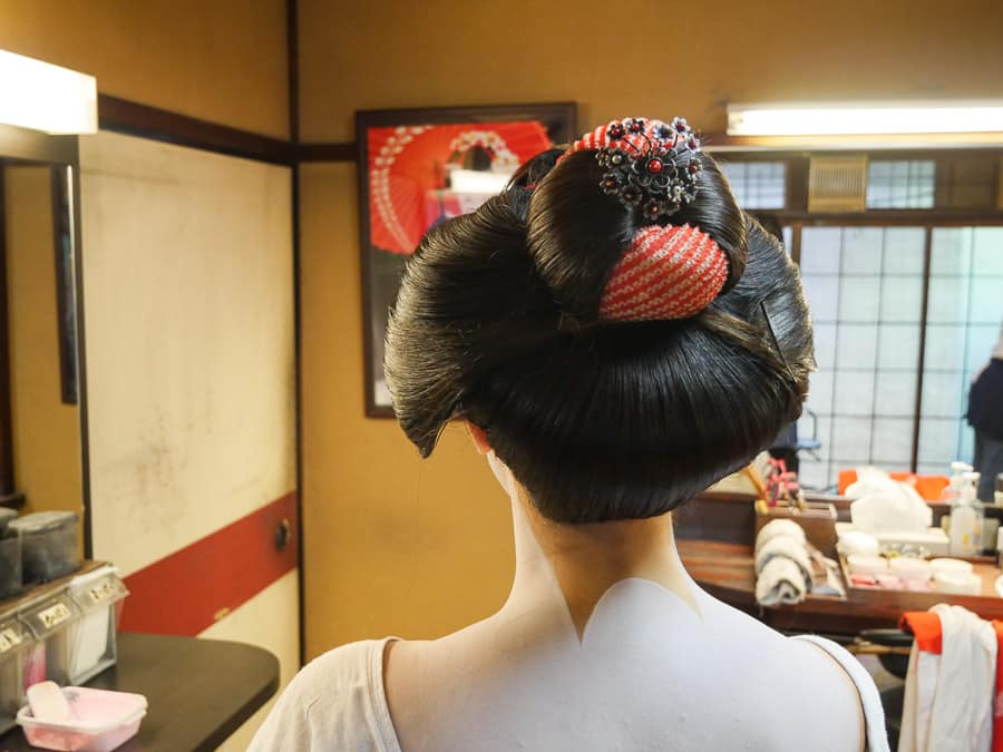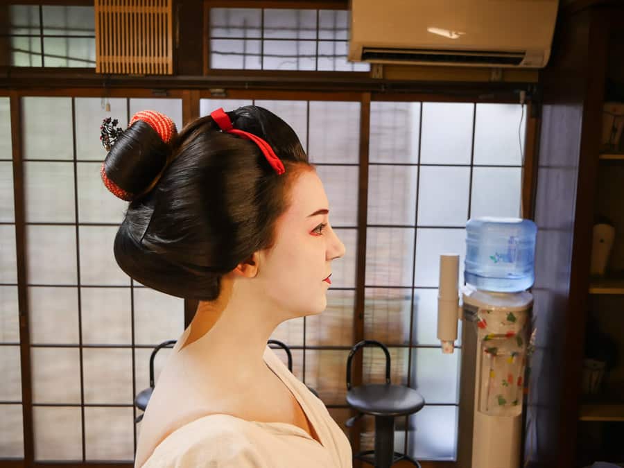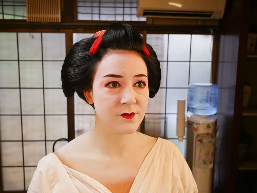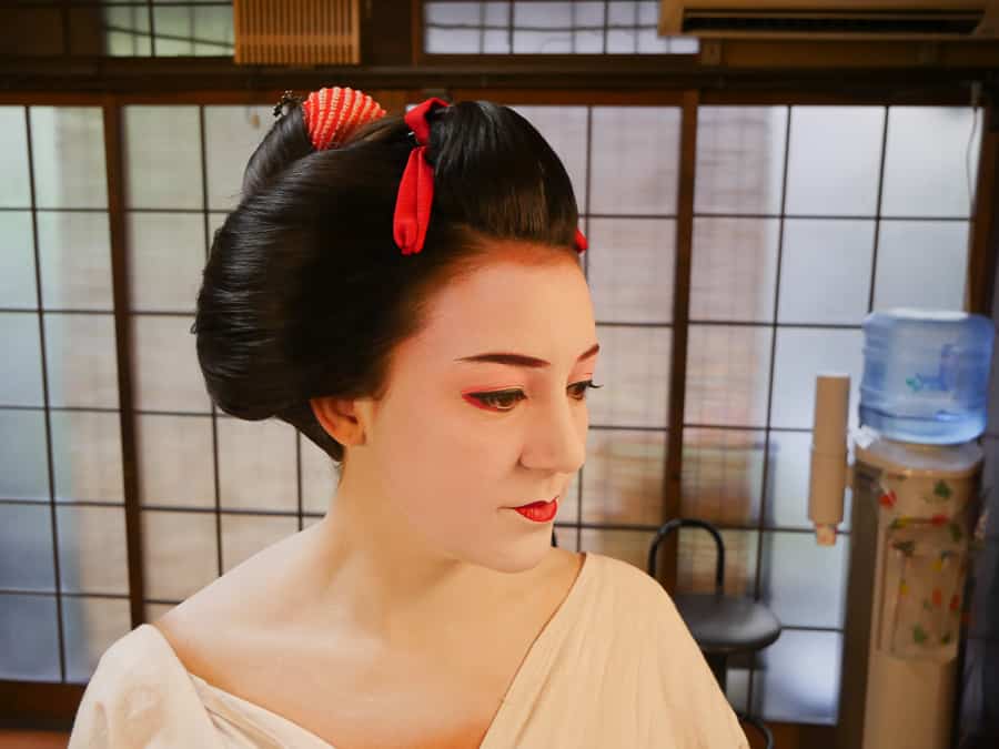 Le maquillage est sophistiqué avec une pâte blanche étalée sur le visage (signe de distinction), un rouge à lèvre rouge sur la bouche en forme de cœur et des yeux crayonnés au pinceau rose. C’est généralement en Maiko que l’on choisit d’être transformée car la geisha est légèrement plus sobre dans sa tenue et sa coiffure.