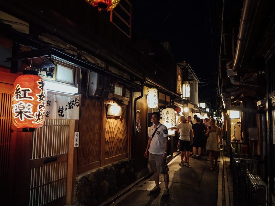 La rue Pontocho! C’est en prenant le pont Shuo que nous avons remarqué ces restaurants du côté de la rivière Kamo qui proposaient de jolis terrasses sur pilotis. L’entrée se fait par la petite et étroite rue piétonne pontocho (entre les rues Sanjo et Shijo) bordée des deux côtés par de nombreux restaurants. Mais quel coup de coeur! On a envie de rentrer partout mais attention, pour mériter une table et s’asseoir sur les petits coussins, il faut souvent débourser environ entre 800¥/p à 1000 ¥/p + minimum 1 consommation. (La priorité étant à ceux qui dînent). Il faut également réserver à l’avance car ils sont pleins tous les soirs donc difficile de venir à l’improviste!