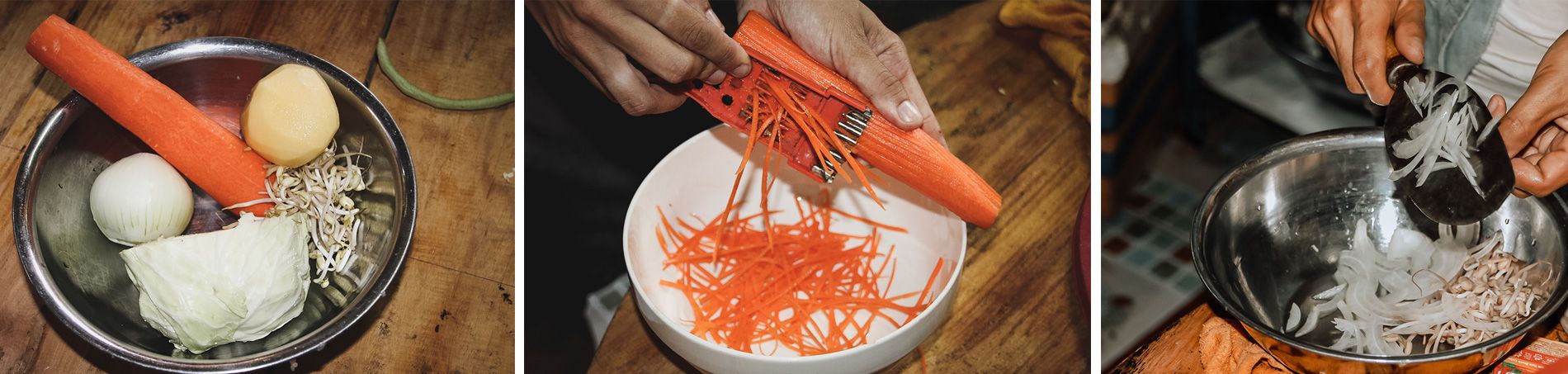 - À l’aide d’une mandoline, émincez en longueur les carottes puis l’oignon, les pommes de terre et le choux en petites lamelles.
