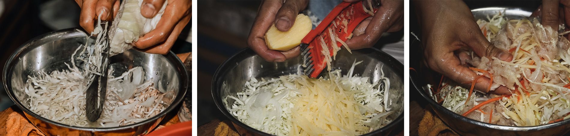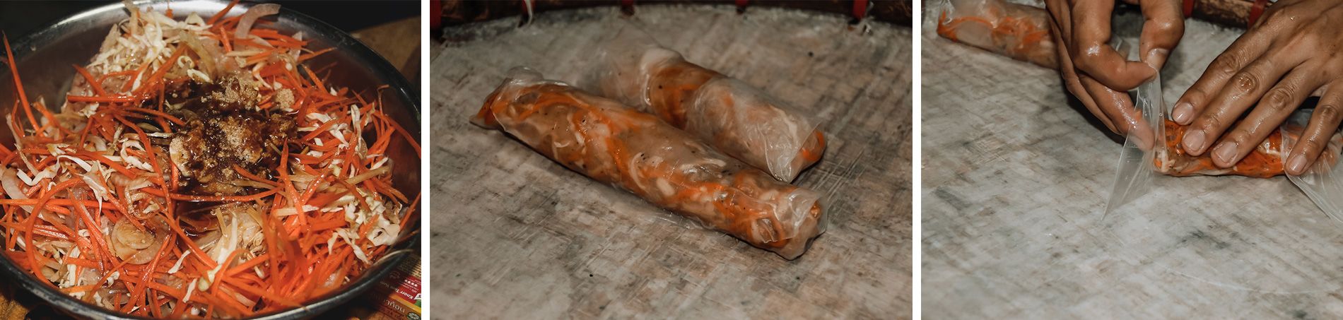 - Coupez le poulet cru en tout petits bouts également (limite haché). Mélanger le tout dans un saladier avec les mains et ajoutez les pousses de soja, le sucre, la sauce soja, la sauce huître ou Nuoc Nam , la poudre de bouillon de légumes et le poivre. Mélangez bien le tout!