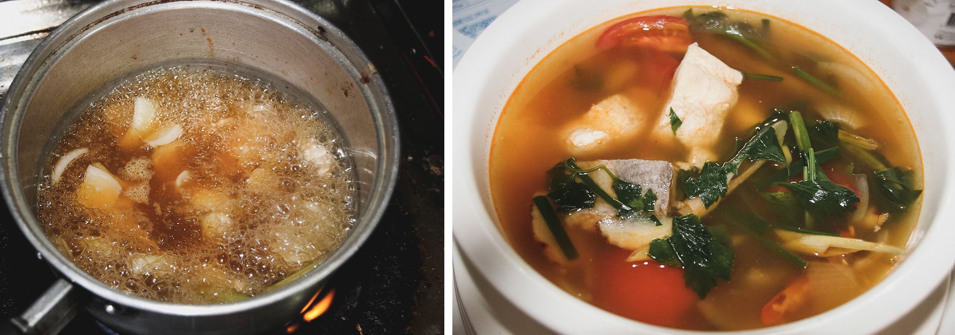 - Dans une casserole, faire bouillir l’eau avec le bouillon de légume, le Galanga (sorte de gingembre que vous trouverez en épicerie asiatique), l’oignon blanc et le bâton de citronnelle coupé en 4. Une fois à ébullition, ajoutez le poisson et laissez cuire 5 min.