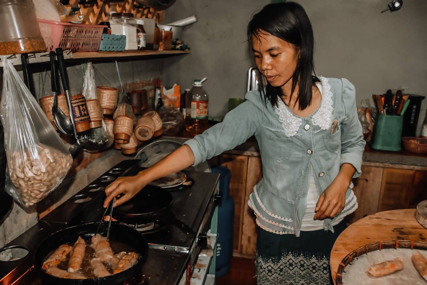 La cuisine Laotienne est diversifiée et revisitée avec des influences thaïlandaises. Notre deuxième pays d’Asie nous a permis de retrouver une variété de plats et de repas plus importants nous permettant donc de nous ressourcer sur le plan culinaire. La cuisine laotienne est à base de riz, agrémenté de viandes, volailles et poissons. Les légumes sont également très nombreux et variés. C’est une cuisine assez pimentée un peu comme la cuisine Thaïlandaise. Nous avons fait un cours de cuisine improvisé lorsque nous étions dans les 4000 îles. En effet, après quelques jours à nous reposer sur ces îles, nous avons trouvé notre cantine laotienne et avons sympathisé avec la propriétaire. Elle nous a gentiment invité dans sa cuisine pour nous apprendre quelques plats. Nous avons choisi de cuisiner les rouleaux de printemps frits (oui c’est bien Vietnamien le nem mais rien à voir avec ceux du Laos) et une soupe que l’on trouve également en Thaïlande mais que nous avons revisité avec les ingrédients laotiens.