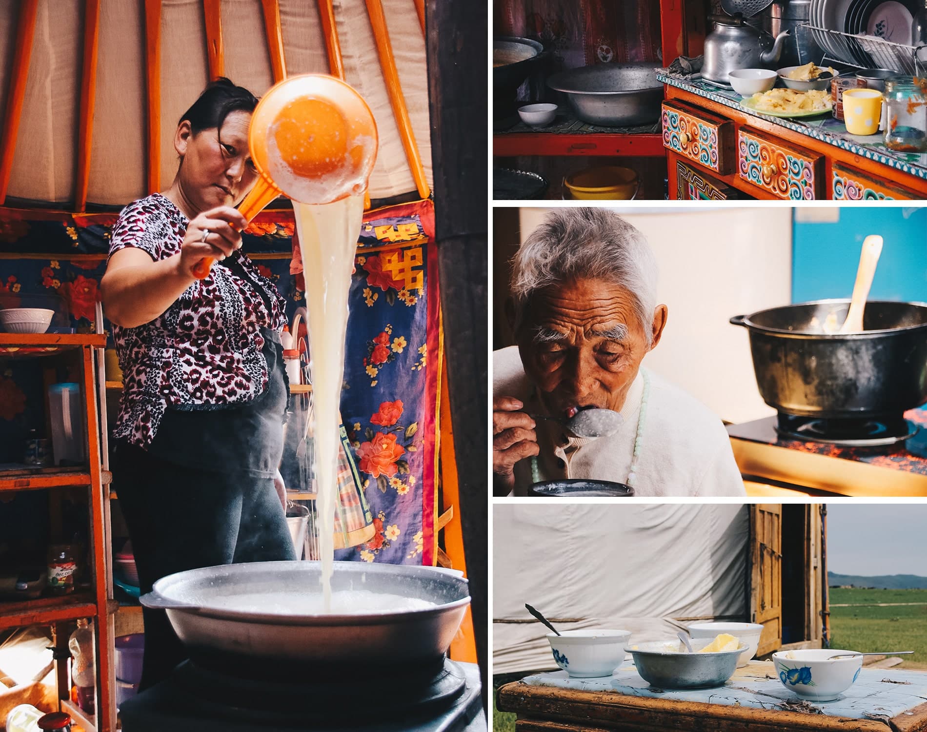 La cuisine Mongole n’a plus de secret pour personne: viande très forte et principalement du mouton, fromages durs et acides, lait de jument (airag) , crème de yak, thé au lait mais de yak ou de jument (Suutei tsai), voilà un petit florilège de ce qui vous attend! Mais pas de panique, l’avantage est que vous allez perdre du poids!
