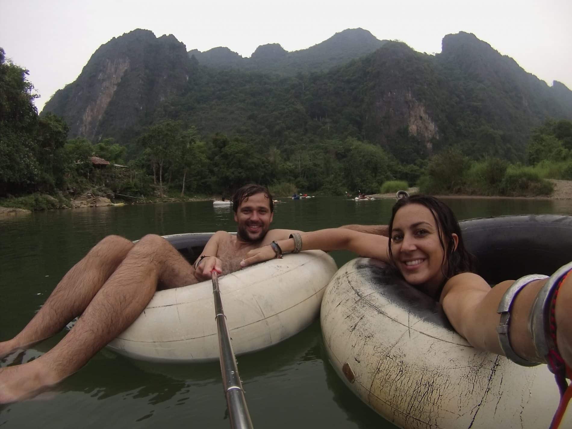 Cette ville située à 150 km au nord de Vientiane et à 6-7h de Luang Prabang possède de nombreux atouts puisqu’elle est entourée de la belle rivière Nam Song, de formations karstiques et de grottes. Ne pas s’y arrêter durant votre séjour serait dommage ! Cependant elle jouit d’une notoriété en raison de l’arrivée massive des backpackers, venus des 4 coins du monde pour se déchainer, boire et faire la fête en mode « spring break » et en pratiquant le tubing, ces bouées faites avec des chambres à air de camion qui glissent sur la rivière. Malheureusement c’est l’image que nous en gardons car nous nous sommes arrêtés 1 seule journée à Vientiane. Nous voulions absolument essayer la descente en bouée sur la rivière pour profiter du paysage et nous avons vite compris que nous allions avoir du mal à éviter les jeux d’alcool, les bains de boue, où les animateurs vous poussent à boire ! L’activité consiste à s’arrêter en route dans de petits bars, pour boire cocktails, bières ou buckets, ces petits sceaux remplis d’alcool. Aujourd’hui, la ville jouit d’une mauvaise réputation suite aux nombreux accidents mortels causés par cette activité et par ces jeunes irresponsables qui sautent dans l’eau complètement éméchés! (20 morts en 2013).