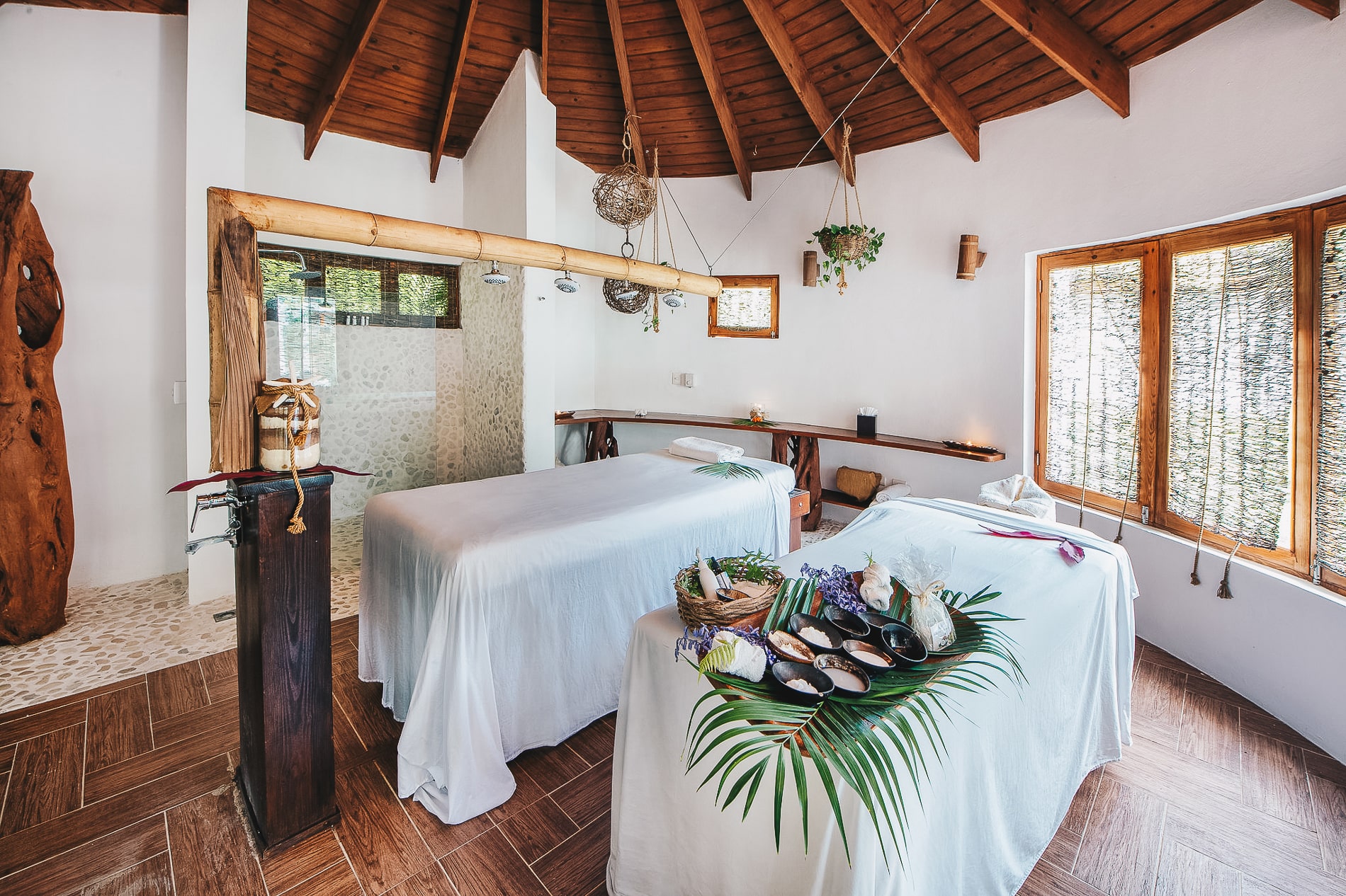 Ouvert de 9h à 20h, le sublime spa exotique comprend trois salles de massage dont une double pour les couples, ainsi qu’un jacuzzi extérieur plutôt central entouré de transats et parasols en lin. Au menu, manucure, pédicure, soins du visage, massage facial et corporel au son du chant des oiseaux et d’une musique relaxante zen.