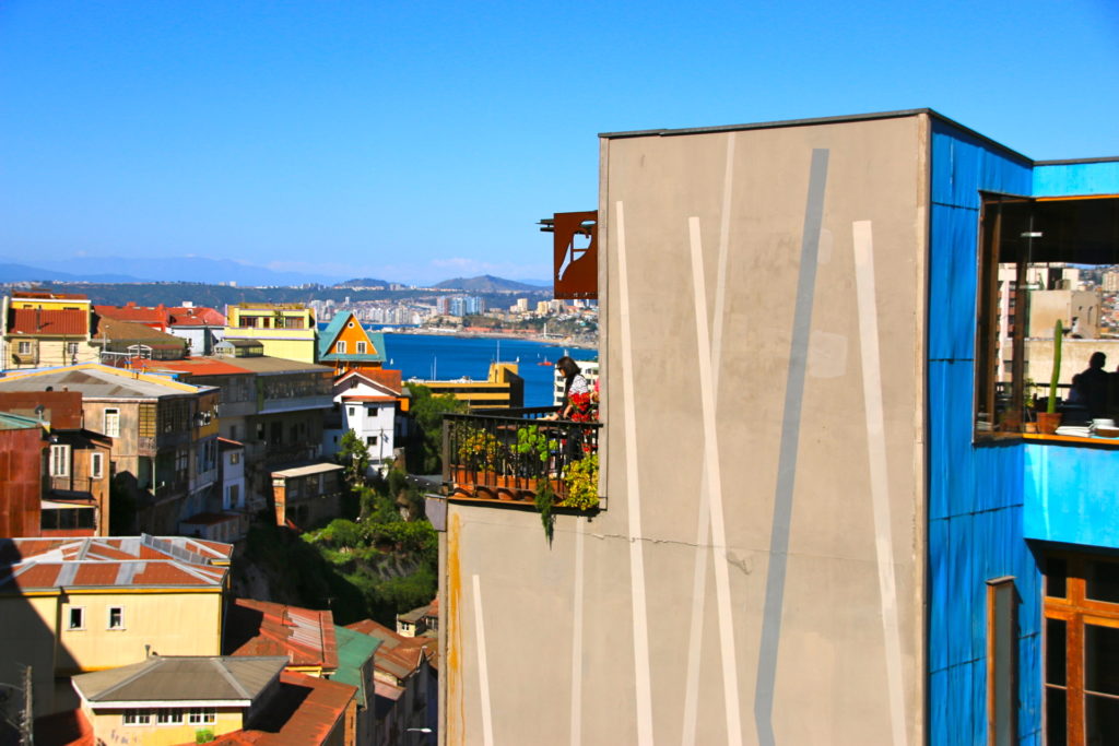 Si vous prenez l’ascenseur Rena Victoria (100p/p) vous arrivez sur le paseo Dimalow. Ici vous avez un hôtel restaurant, le Fauna qui offre une jolie vu panoramique du quartier de Valparaiso. Faites y une pause 🙂