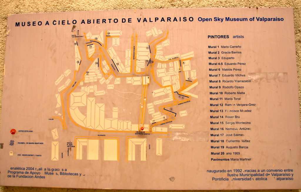 Située sur le Cerro Bellavista, en prenant l’ascenseur Espiritu Santi de la rue Aldunate (300 pesos /p la montée), vous arrivez dans le musée gratuit à ciel ouvert.