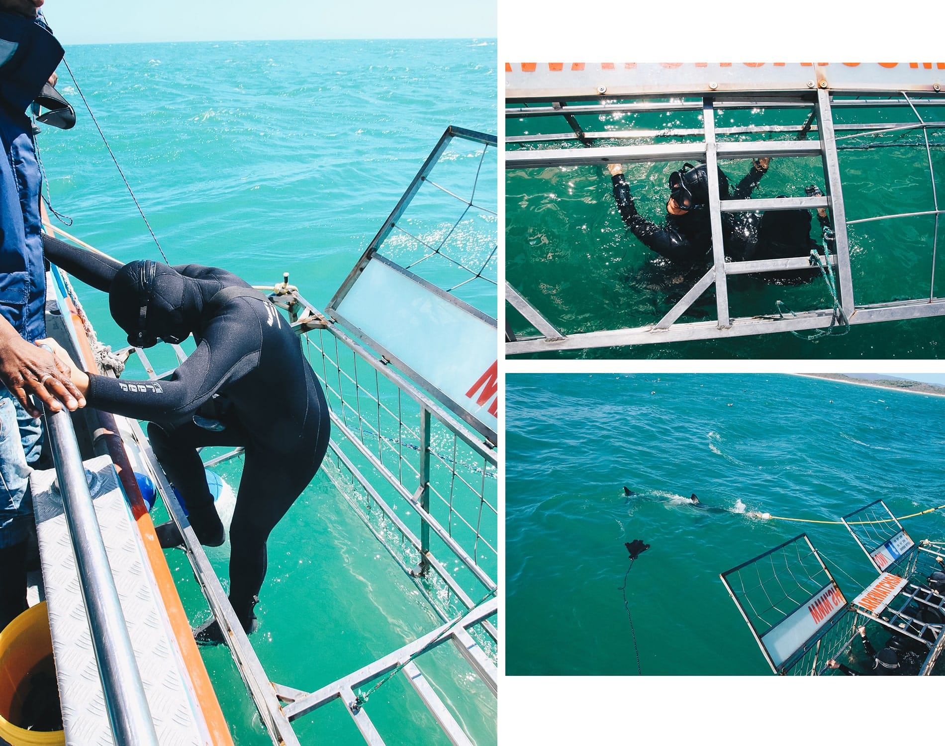 As our excursion was scheduled for 1pm, our day began with an included lunch around the activity presentation brief. We then joined the boat in the harbor and headed out to sea. The crossing didn’t take long: 15 minutes later we were on the spot. No sooner had the boat stopped than the first fin appeared on the surface. (I want to be clear that our boat dumped into the water what they call “chum”, a liquid made from fish and tuna oil before diving the cage into the water. Some boats throw real pieces of fish)