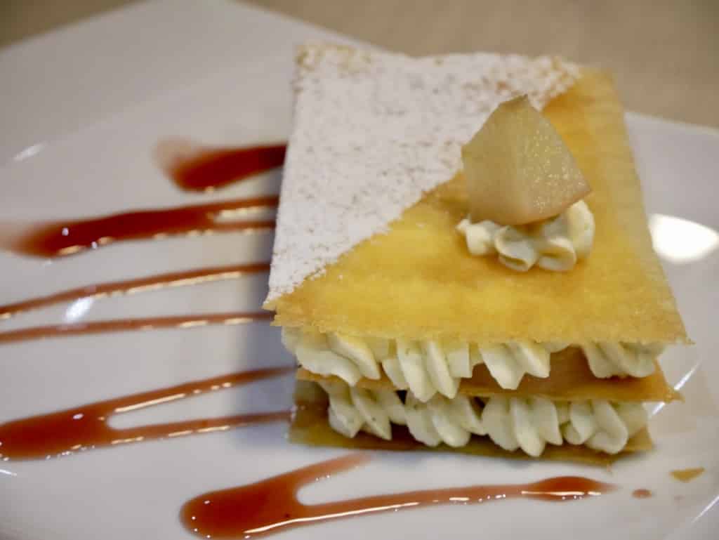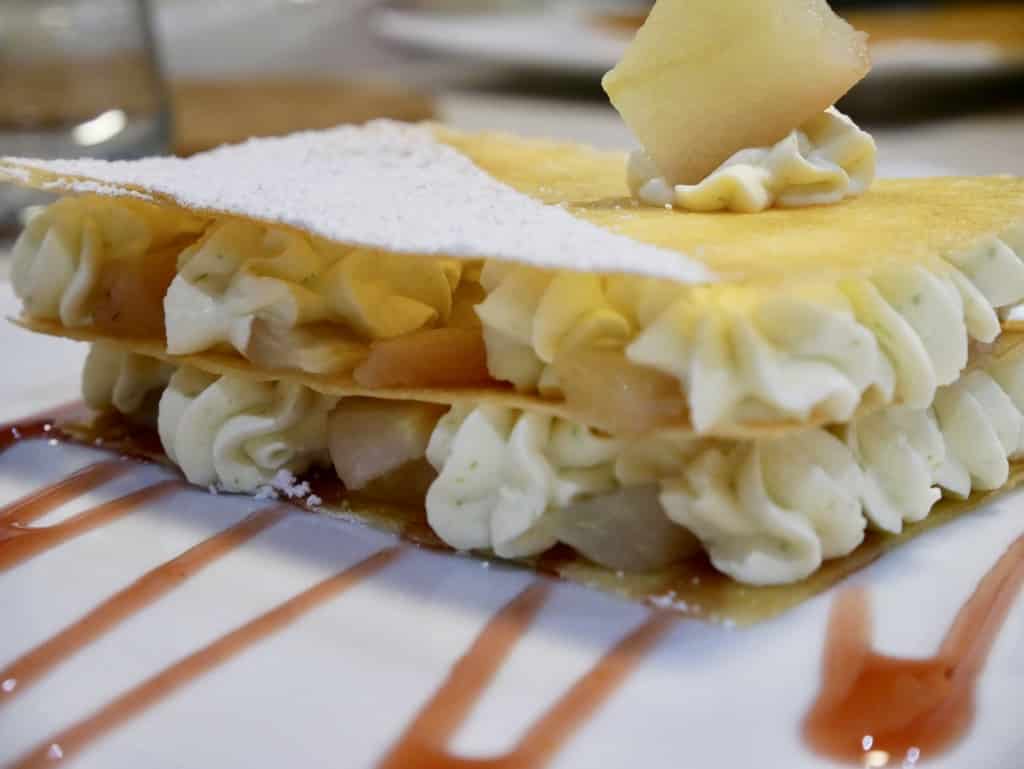 For us, it’s a superb crispy millefeuille, poached pears with hibiscus and white chocolate-lime ganache, all whipped up with our own whipped cream. An original and delicious recipe that made our taste buds salivate and whetted our appetites. It’s a real light, gourmet moment that we recommend and that we’ll be happy to make again at home to impress our loved ones at Christmas. As a side note, we gave this millefeuille recipe to our caterer for our wedding. We revisited it with a whole pear poached in Hibiscus, and our guests were delighted by this light, gourmet dessert.