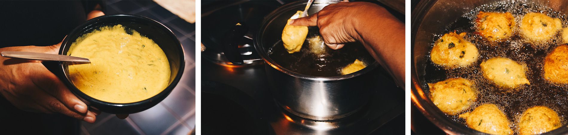 - Spoon the dough into the oil, which will form a ball when cooked.