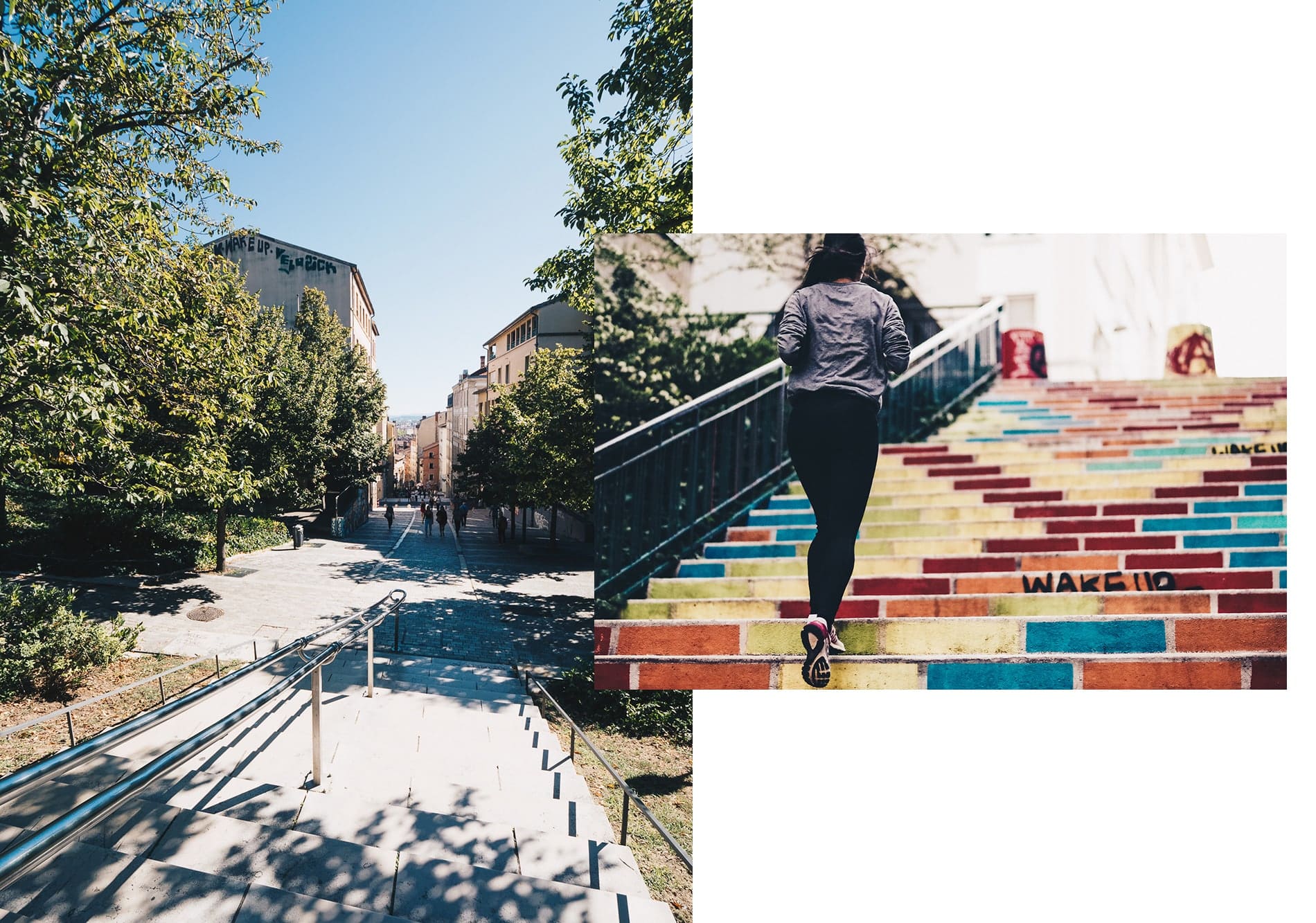 - Free and sporty : in 15 minutes on foot, simply take the escaliers de Lyon on the n°2, rue Prunelle. This pretty, colorful fresco (which may recall the staircases of Rio de Janeiro) was created by local volunteers. At the top of the steps, turn right to cross the pretty Jardin des Plantes, then you’ll tackle the climb up to Croix-Rousse via the montée de la Grande Côte.