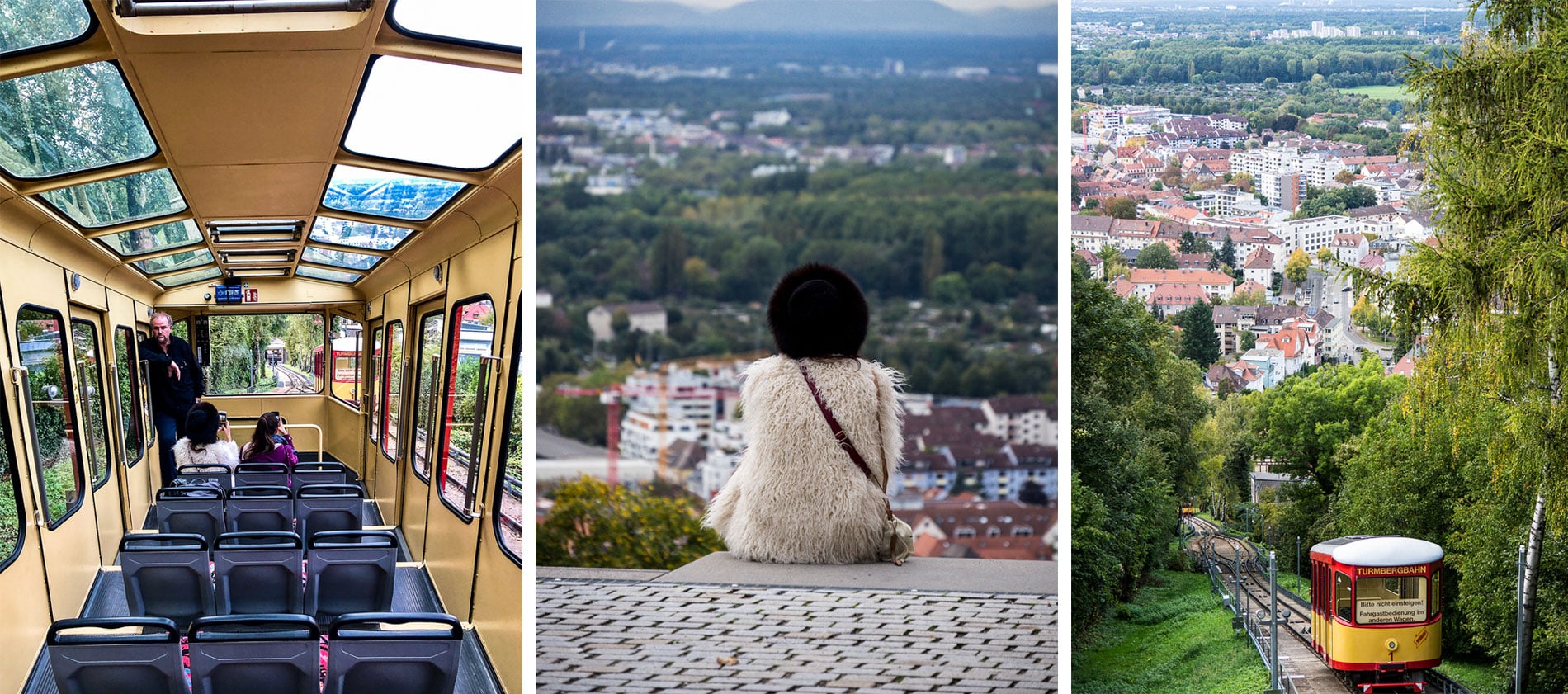 At the top of the 256-metre-high hill is the mountain Turmberg, (meaning Tower Mountain, rue Bergbahnstrasse ) a fairly quiet location, with panoramic views over the city and surrounding area. There are 2 ways to get there: either climb the 500-plus steps or, as I did, take Germany’s second oldest aerial tramway. The climb is quite rapid and well worth the effort. We found a very nice terrace to warm up in autumn, the “Anders auf dem Turmberg“. From Karlsruhe city center, take the streetcar line 1 and get off at Durlach Turmberg. Don’t forget to use the free card that you have purchased in advance. Otherwise, count €3/person for the climb