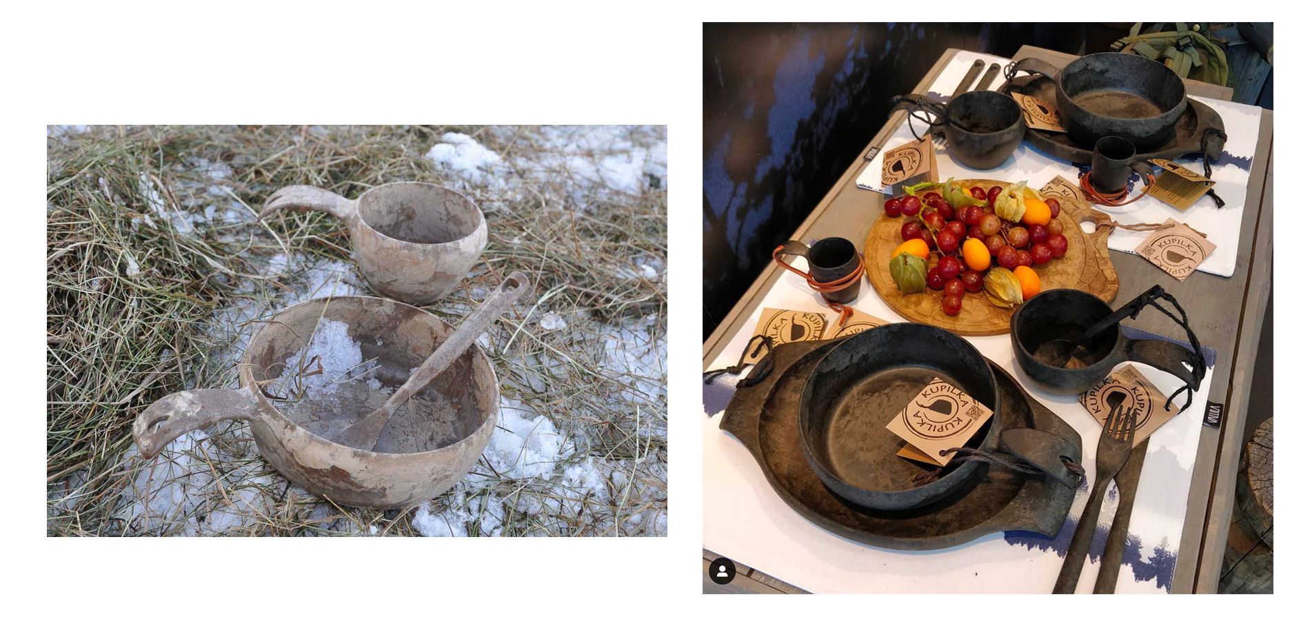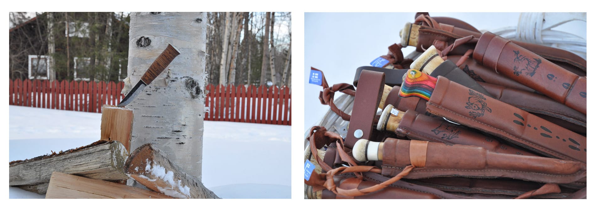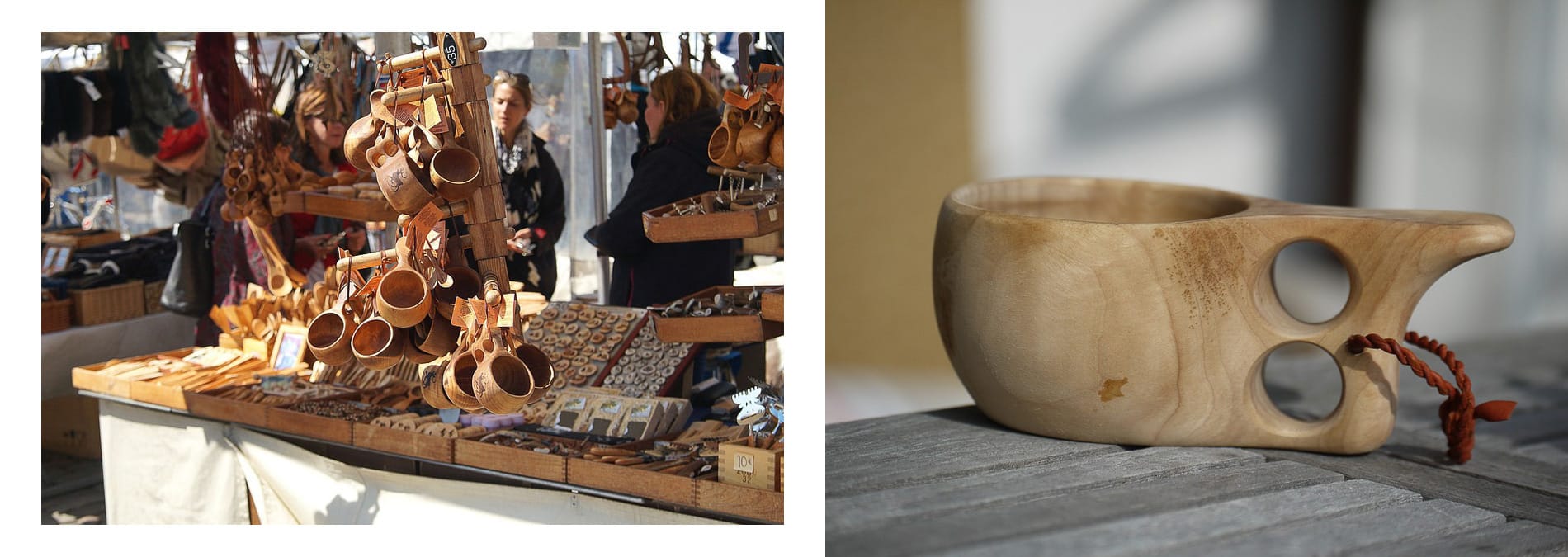 Lorsque je vivais la bas, j’avais autour de ma ceinture de guide, une kuksa, cette incontournable petite tasse en bois, taillée principalement dans ce que l’on appelle la loupe du bouleau, c’est à dire l’excroissance ligneuse qui pousse sur le tronc et les branches de certains arbres. Les kuksas servent à boire votre jus de baie froid ou chaud, de l’eau, du café, du thé mais aussi de rhum chaud ou de la vodka. On peut y déposer également des baies fraîchement ramassées l’été. Elles peuvent être gravées et de plusieurs tailles. Comptez en moyenne 40-50 euros pour une tasse, certaines grimpent à 70€.
