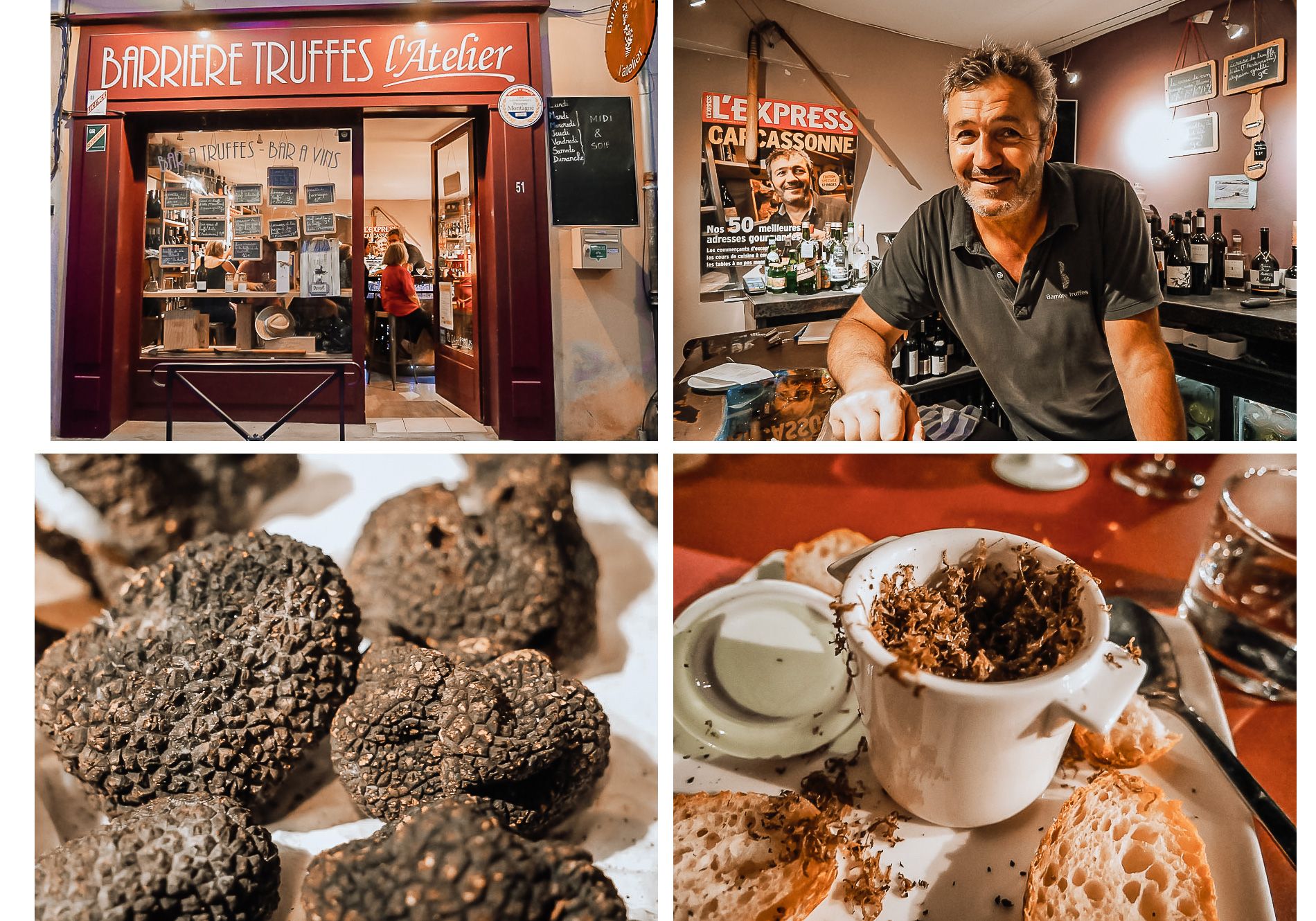 Place à la gastronomie maintenant et pas n’importe laquelle, celle de la truffe. Nous qui pensions que ce champignon était une exclusivité du Périgord, et bien nous avons découvert que l’Aude n’avait pas à l’envier. Pour cela, rendez-vous dans la ville de Carcassonne, au pied de la cité médiévale, dans le bar à Tapas L’atelier de la truffe de Philippe Barrière et de sa femme. Amoureux des bons produits du terroir, cet ancien conseillé trufficole continue d’exploiter sa truffière et a créé ce petit bar dans le but de faire connaître la truffe et de la rendre moins élitiste.