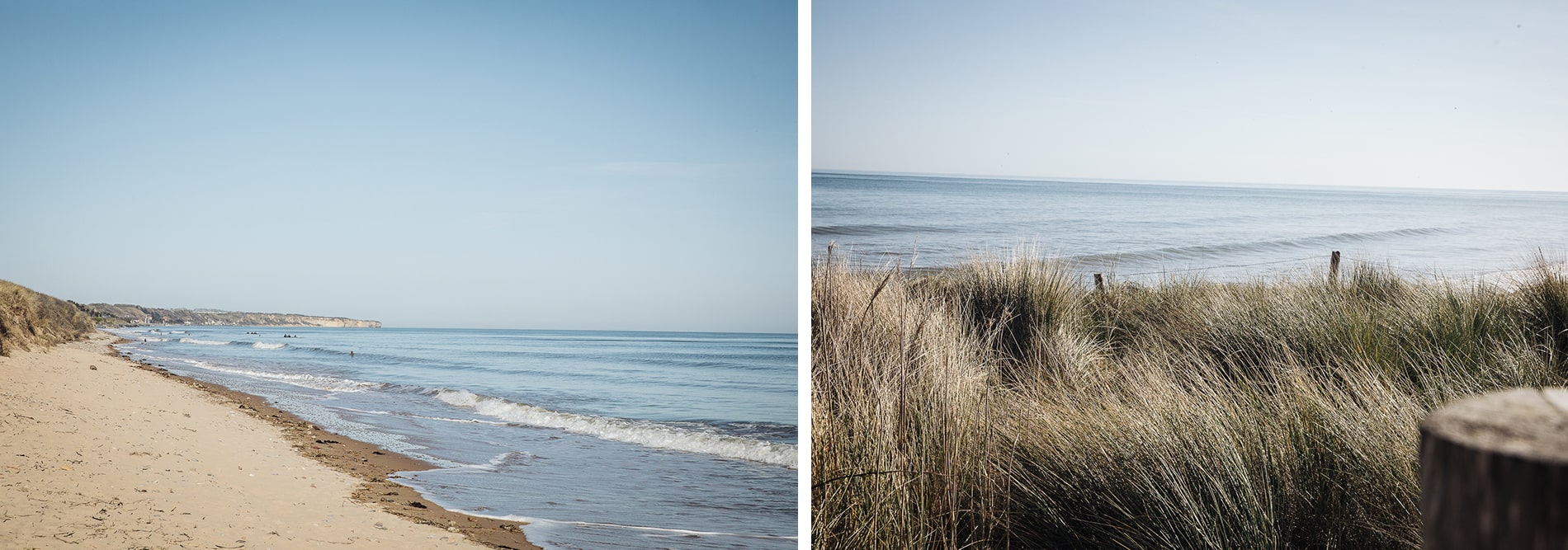 Cette magnifique plage où le sable est de couleur ocre est longue de 6 kilomètres. Suite aux recommandations des propriétaires de la ferme de Billy, nous avons choisi d’y passer la nuit près des dunes de sable, en contrebas du cimetière américain et nous n’avons pas regretté notre choix. Nous nous sommes réveillés avec le bruit des vagues et au petit matin, nous en avons profité pour faire la petite balade sur le sentier en remontant par la vue depuis le cimetière américain.
