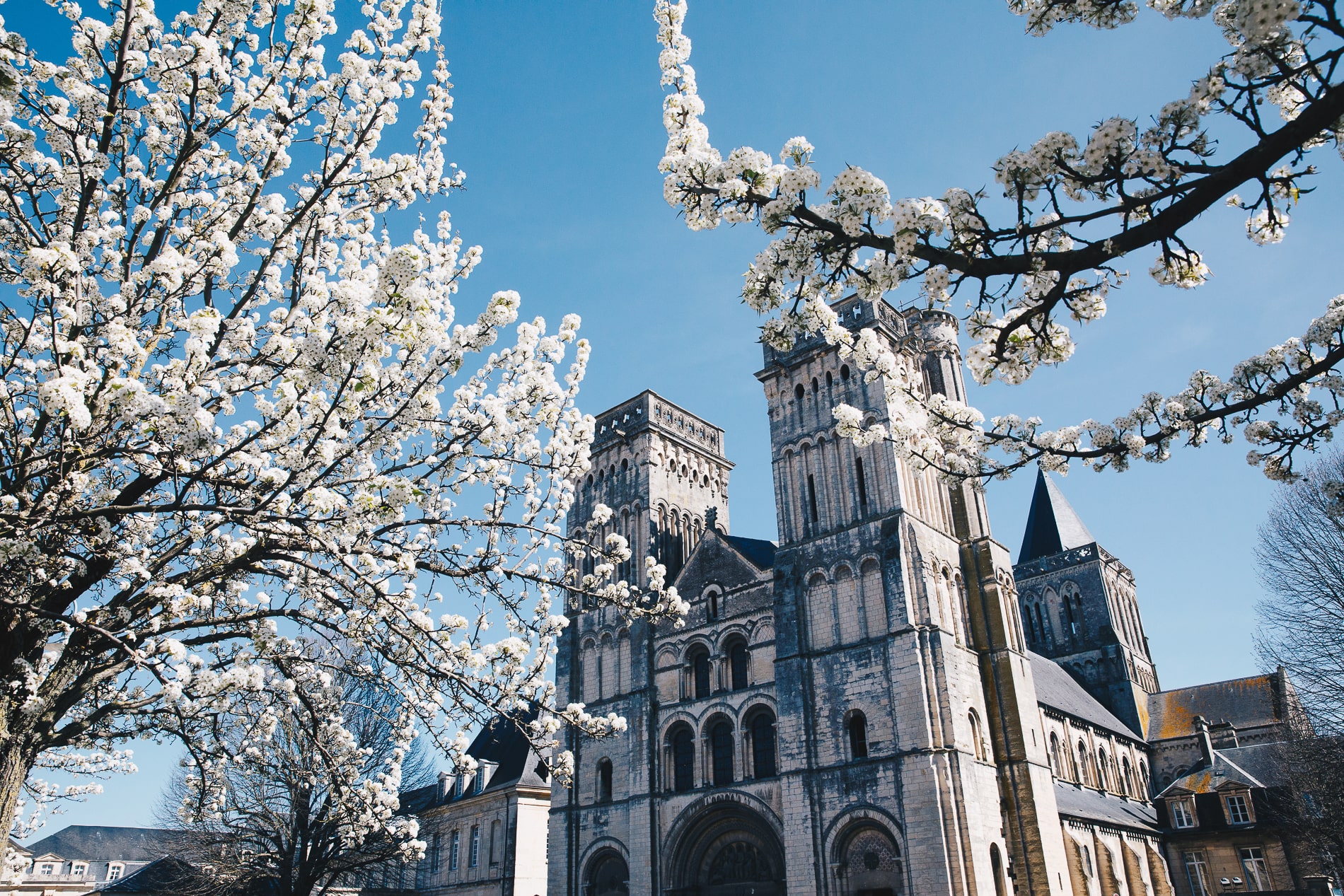 La ville de Caen classée dans le Top 10 des villes de France où il fait bon vivre et des villes les plus vertes de France, est connue pour sa douceur de vivre mais également pour les trésors de son patrimoine datant de 1000 ans. On n’a pas eu beaucoup de temps pour arpenter le ville mais nous nous sommes tout de même arrêtés devant la très belle abbatiale romande de l’abbaye aux Dames, l’un des joyaux du patrimoine normand. Les cerisiers en fleurs tout autour, la sublimaient sous ce soleil de plomb. Puis direction l’abbaye aux hommes, une merveille des architectures romanes et gothiques, fondée en 1063 par Guillaume le Conquérant et abritant encore son tombeau. En temps normal, il est possible de visiter le cloître, les jardins, le réfectoire des moines, la salle des mariages….