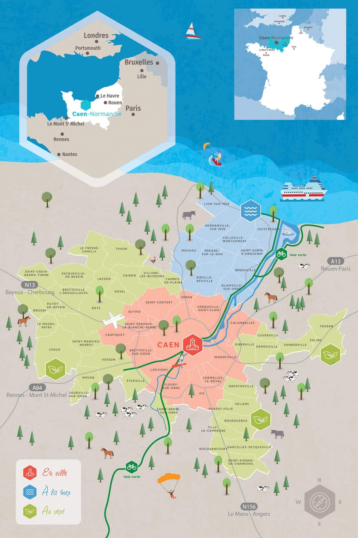 Située à égale distance de Rouen et du Mont Saint Michel, Caen la Mer est au coeur de la Normandie. Plusieurs transports permettent de vous y rendre facilement :
